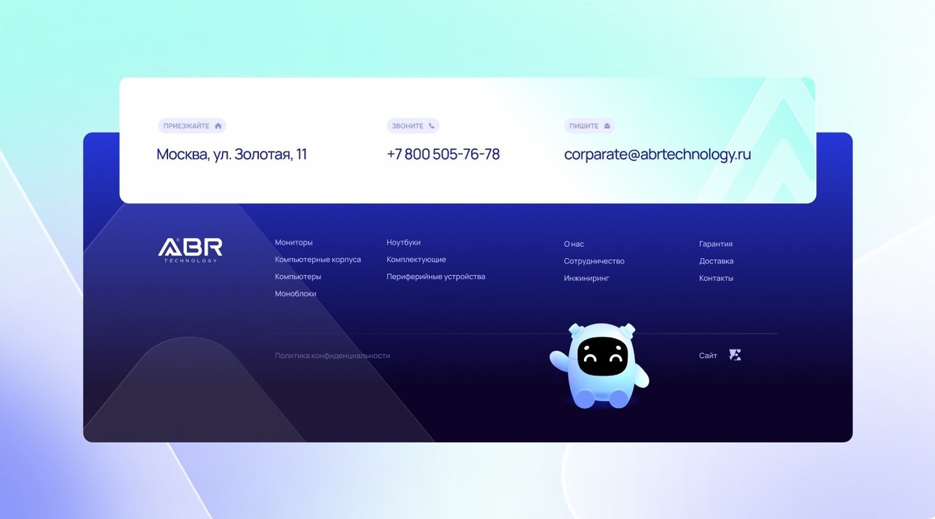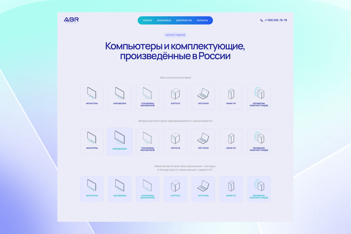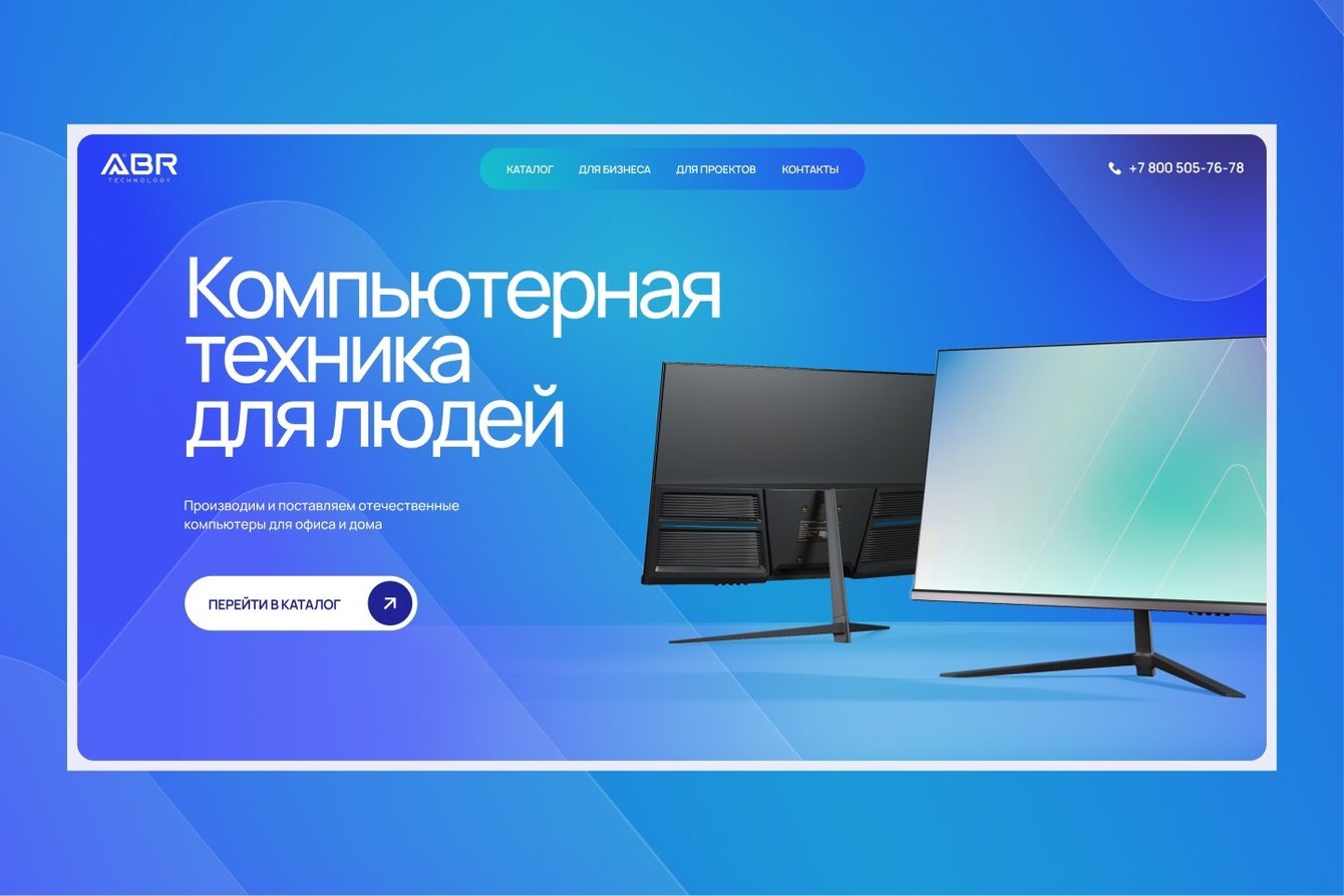 ABR Technology — ведущий разработчик, производитель и поставщик компьютерной техники в России. Компания работает как с государственными и корпоративными, так и частными заказчиками, поэтому на сайте было важно правильно преподнести товары для всех ключевых аудиторий. Кроме того, ABR Technology постоянно совершенствуют отечественные технологии — новые компьютеры бренда превосходят аналоги по мощности, эффективности и безопасности, но, при этом, остаются в доступном ценовом сегменте.