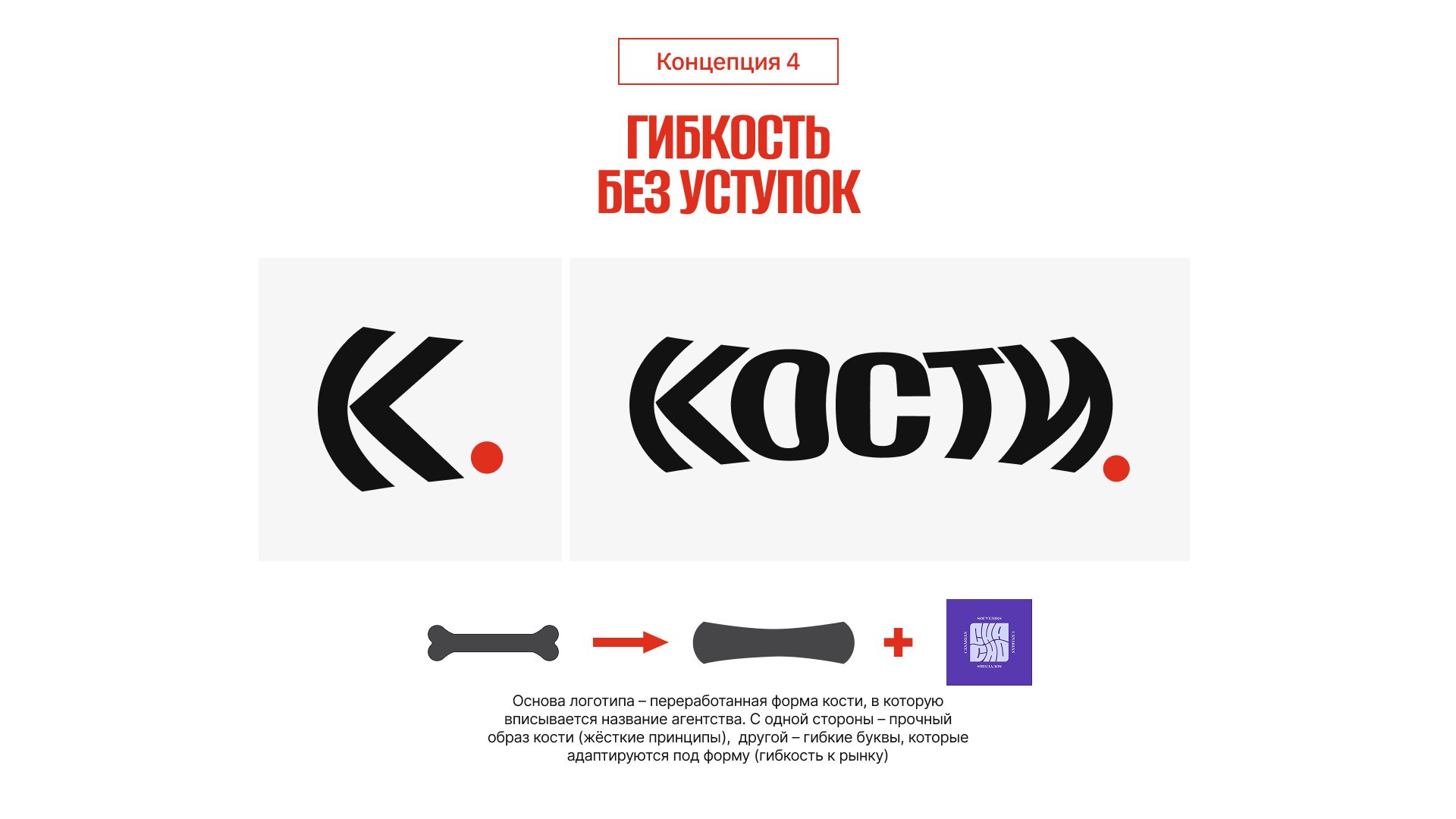 Идея построена на противоречии: агентство гибкое для своих клиентов, но бескомпромиссное по качеству работы. В позиционировании «без уступок» — прочность агентства, ее показали через материал — упрощенную форму кости. А гибкость показали с помощью букв, которые искажаются по форме кости.