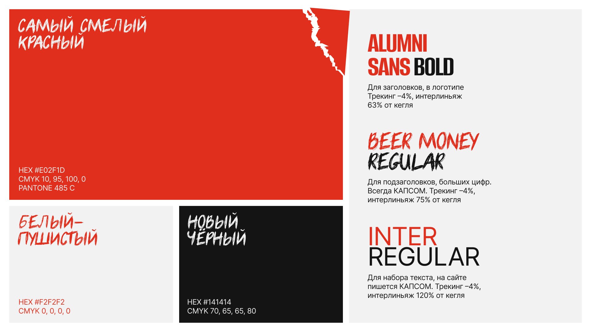 С помощью фирменного стиля удалось передать позиционирование — каждый элемент работает на общую задачу. Яркие контрастные цвета, сломы в заголовках, рваные края фотографий, фактурные фоны и разнообразие — все это создает смелый образ с характером «контента на костях».