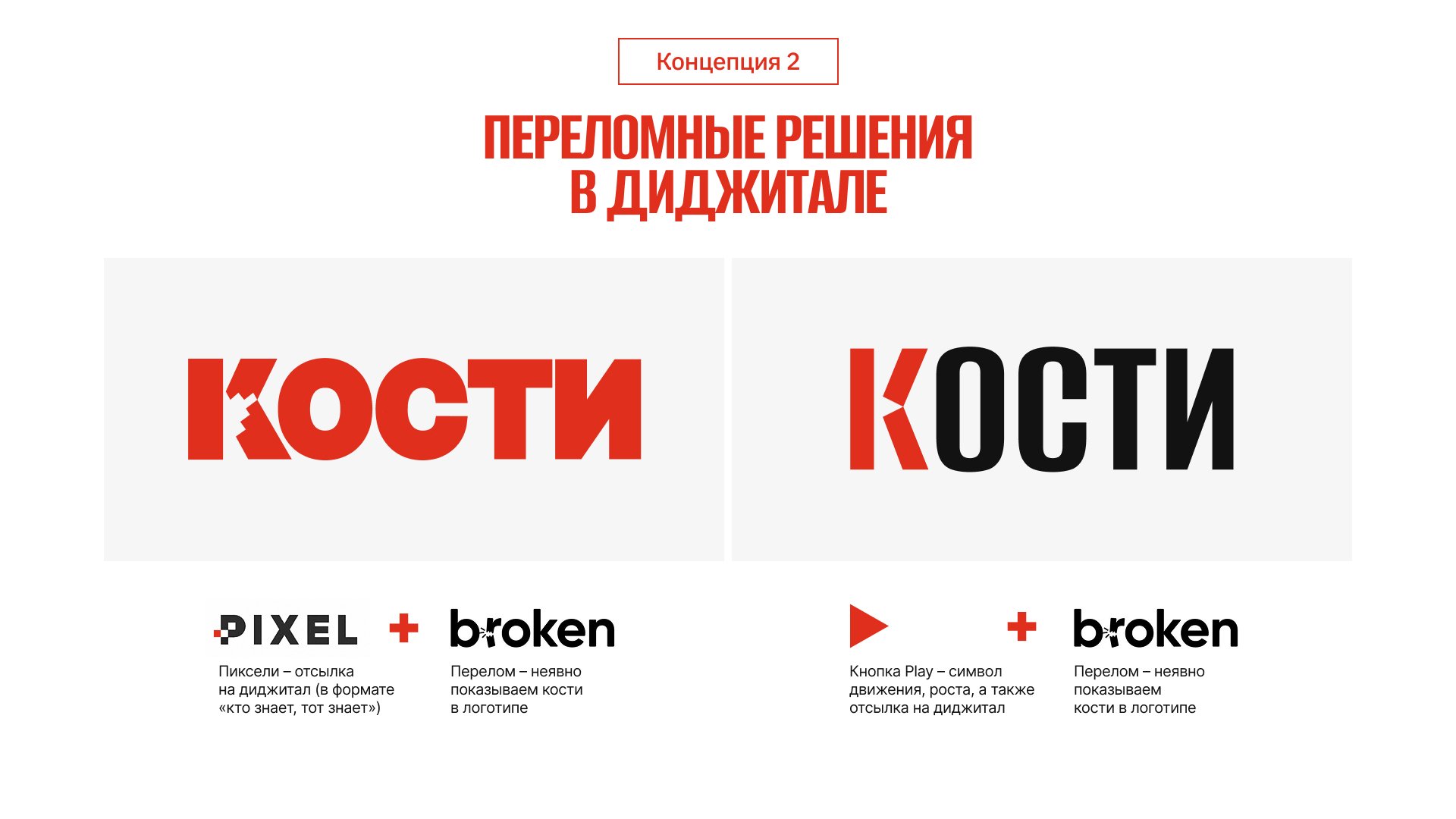 «Кости» — смелые и активные ребята, поэтому все в логотипе сигнализирует об этом, особенно активный красный цвет и бросающаяся в глаза идея. Логотип точно передает суть бренда.