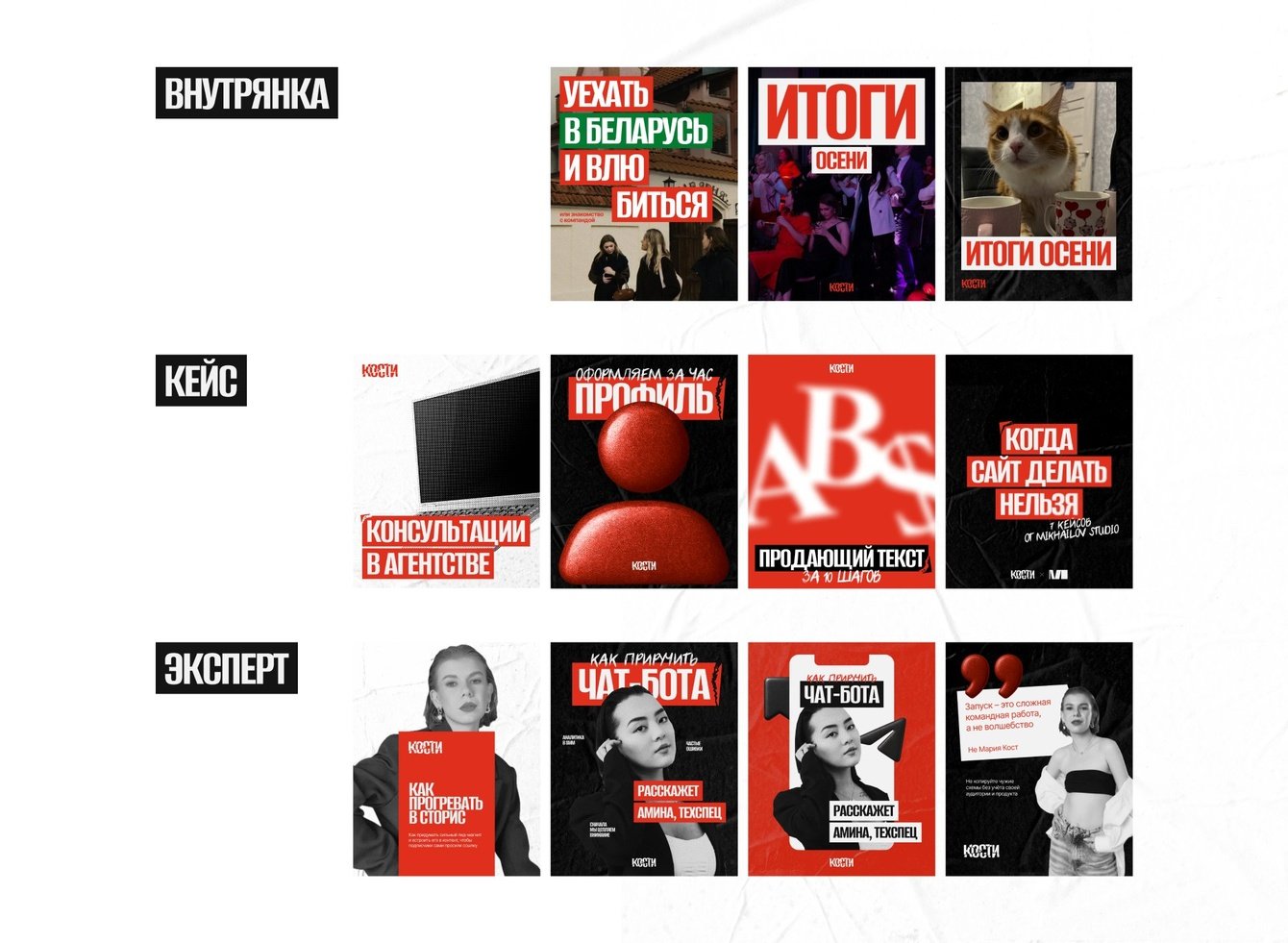 ▪️ Рубрика «Внутрянка» — кухня агентства, где максимально искренние посты, а значит необходим более “расслабленный” визуал. Здесь основным элементом решили сделать фотографии.