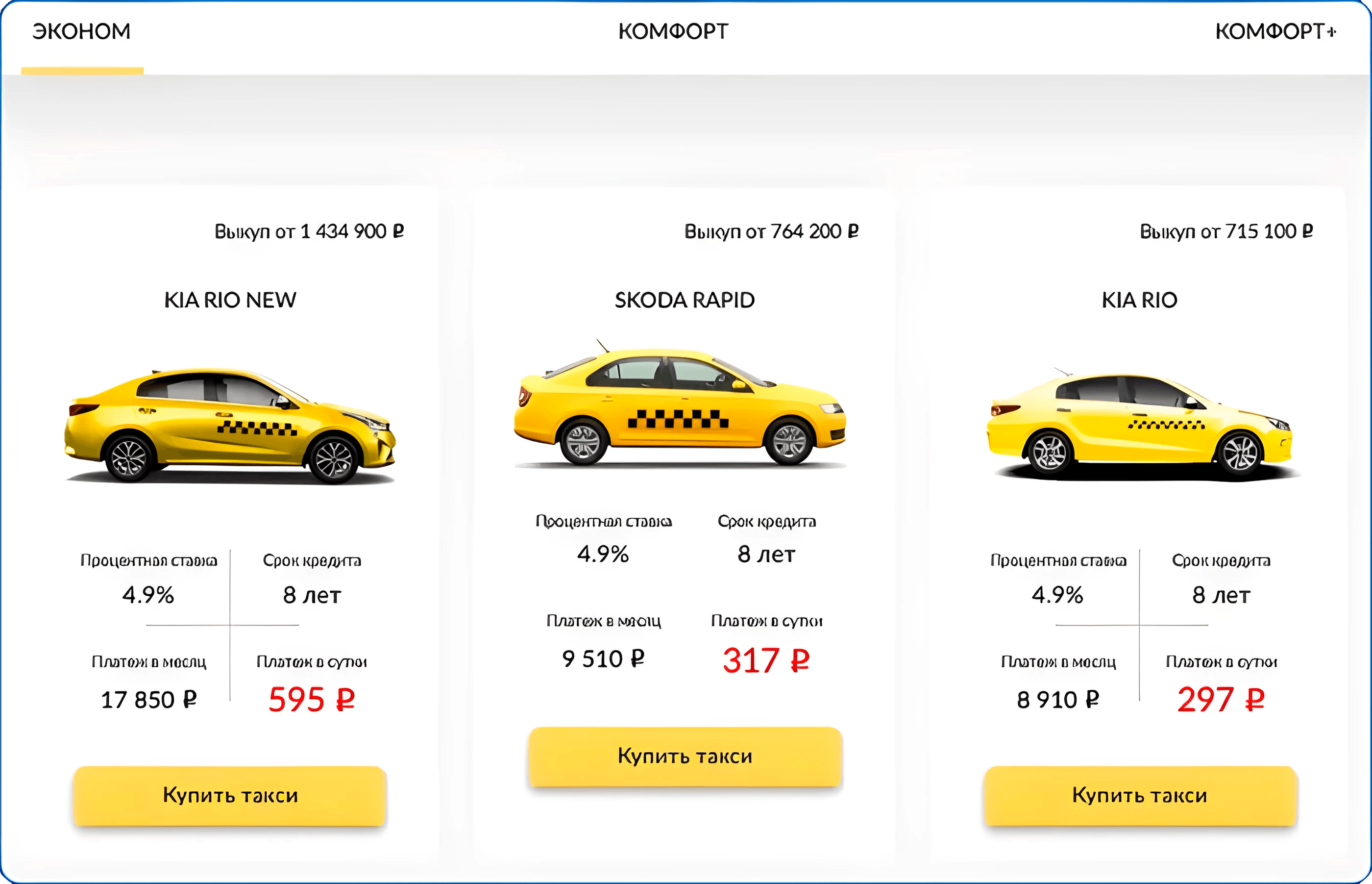 Создали блок с тремя вариантами подбора автомобилей для такси в различных ценовых категориях: эконом, комфорт, комфорт+. Это позволило максимально прозрачно представить условия покупки в кредит и размер ежемесячного платежа.