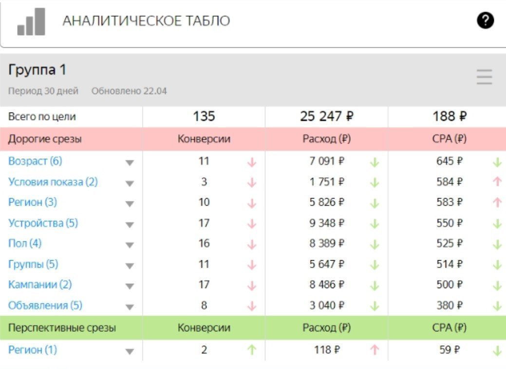 Проанализировав срезы, которые нам предложило аналитическое табло, внесли следующие корректировки для рекламных кампаний по срезам:
