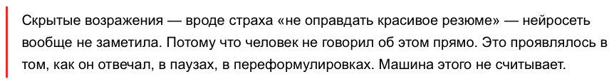 В итоге Нейросеть цеплялась за незначительные детали, игнорируя главное, интерпретировала потребности поверхностно — как студент, который знает теорию, но не понимает людей, и выдавала откровенные галлюцинации — «инсайты», которых не было в интервью.