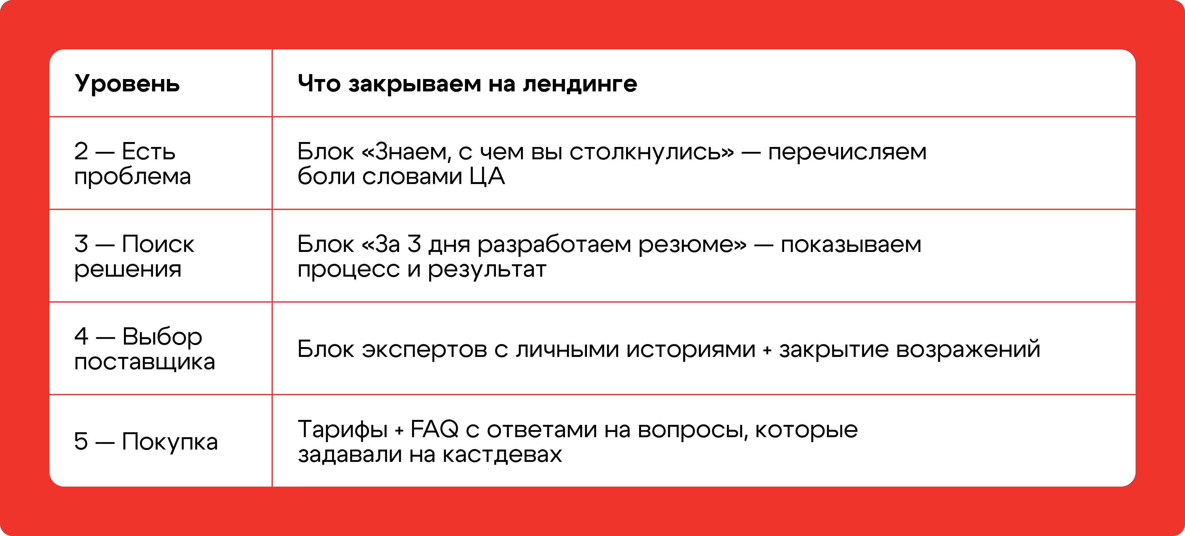 Все находки мы разложили по уровням осознанности клиента: от «есть проблема» до «готов купить». Это позволило выстроить логику лендинга так, чтобы каждый блок отвечал на вопросы конкретного этапа.