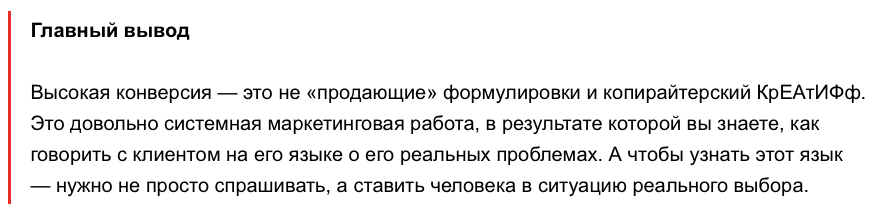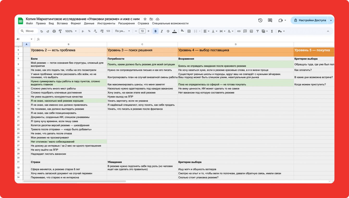 Результат: 20% всех оплат пришлось именно на карьерные консультации. Мы не потеряли аудиторию, которая «ещё не готова» — мы предложили им подходящий продукт и помогли клиенту заработать на этом денег. Без глубинного исследования это было бы просто невозможно. А когда у тебя в эксельке горит жирное возражение, ты не можешь его не закрывать :)