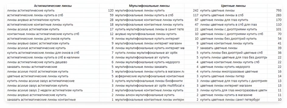 ● по общим целевым запросам (интернет магазин линз и т. д.)