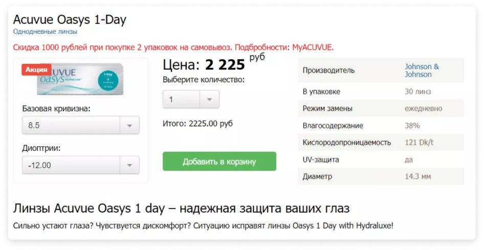 Оформление карточки товара содержит фото упаковки, цену, описание и кнопки с фильтрацией ключевых характеристик линз. Карточку дополняет информация с акционным предложением и подробным описанием товара.