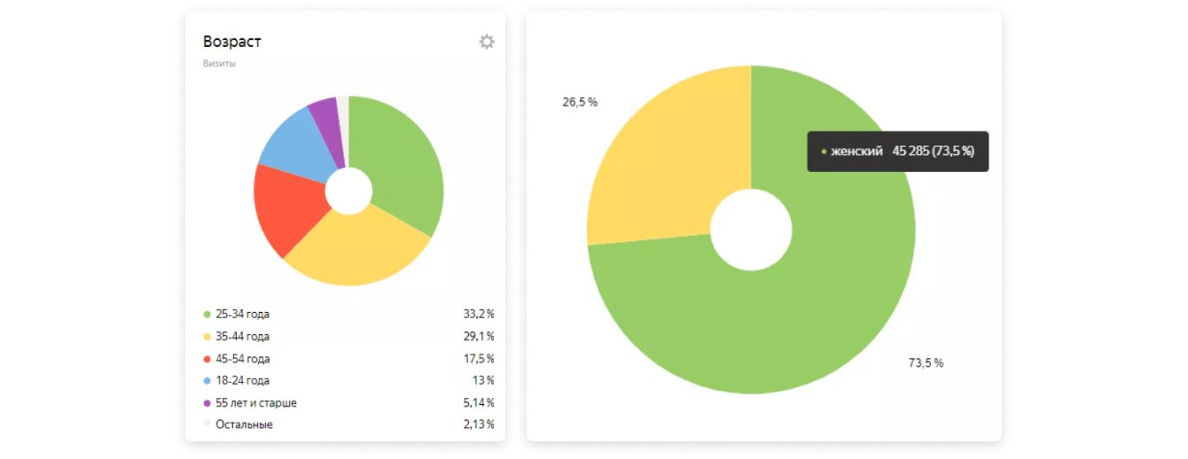 Ядро целевой аудитории по статистике Яндекс.Метрики — в основном женщины в возрасте 25-34 лет. Женская ЦА совершает порядка 70% всех покупок из рекламы.