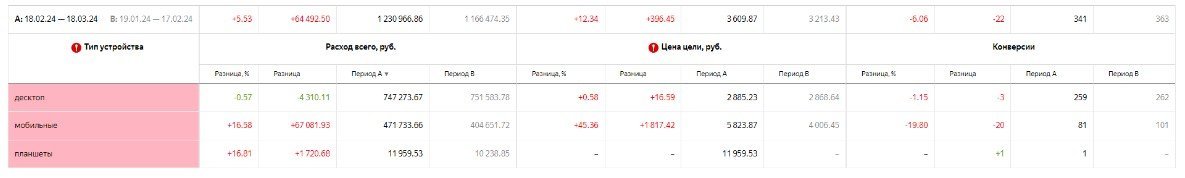 Сделали понижающую корректировку на мобильные -15%, т.к цена лида по ним была выше, чем на десктопе.