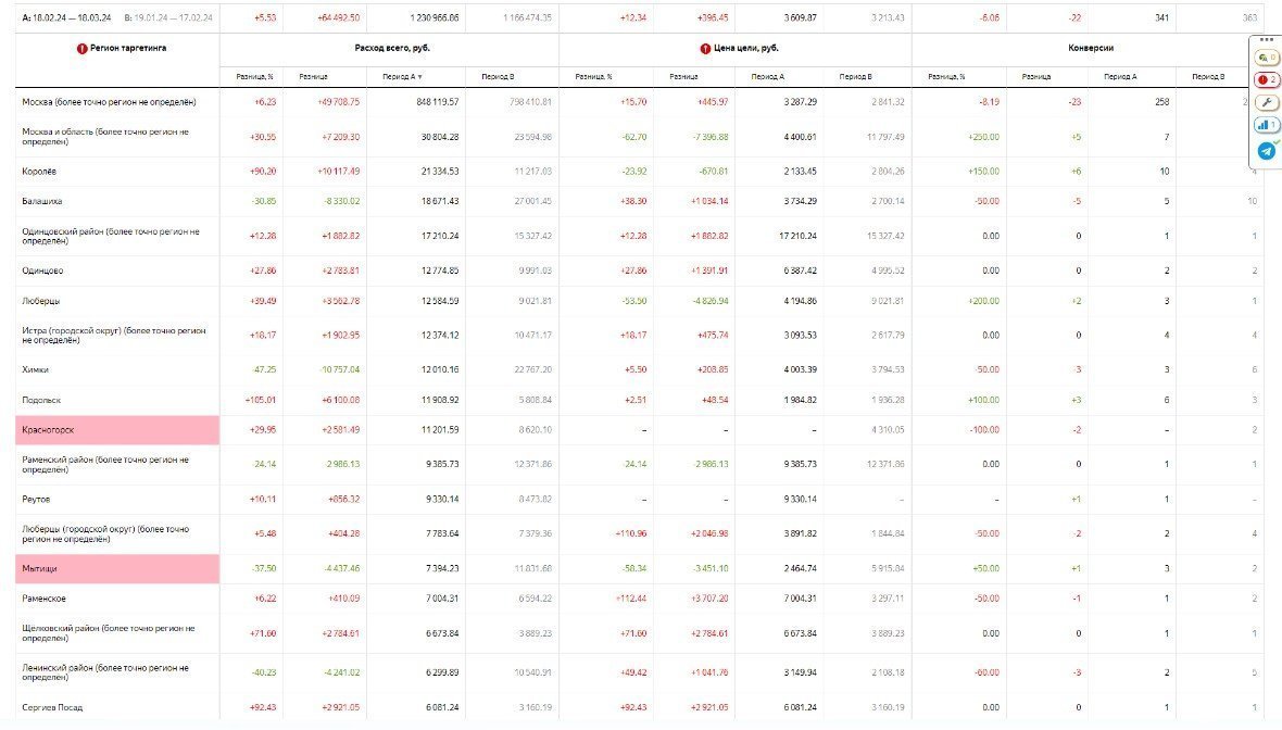 Сделали понижающие корректировки на Красногорск, а также Раменский район и Реутов, Ленинский район и Истру на -20%, т.к они были неэффективны.