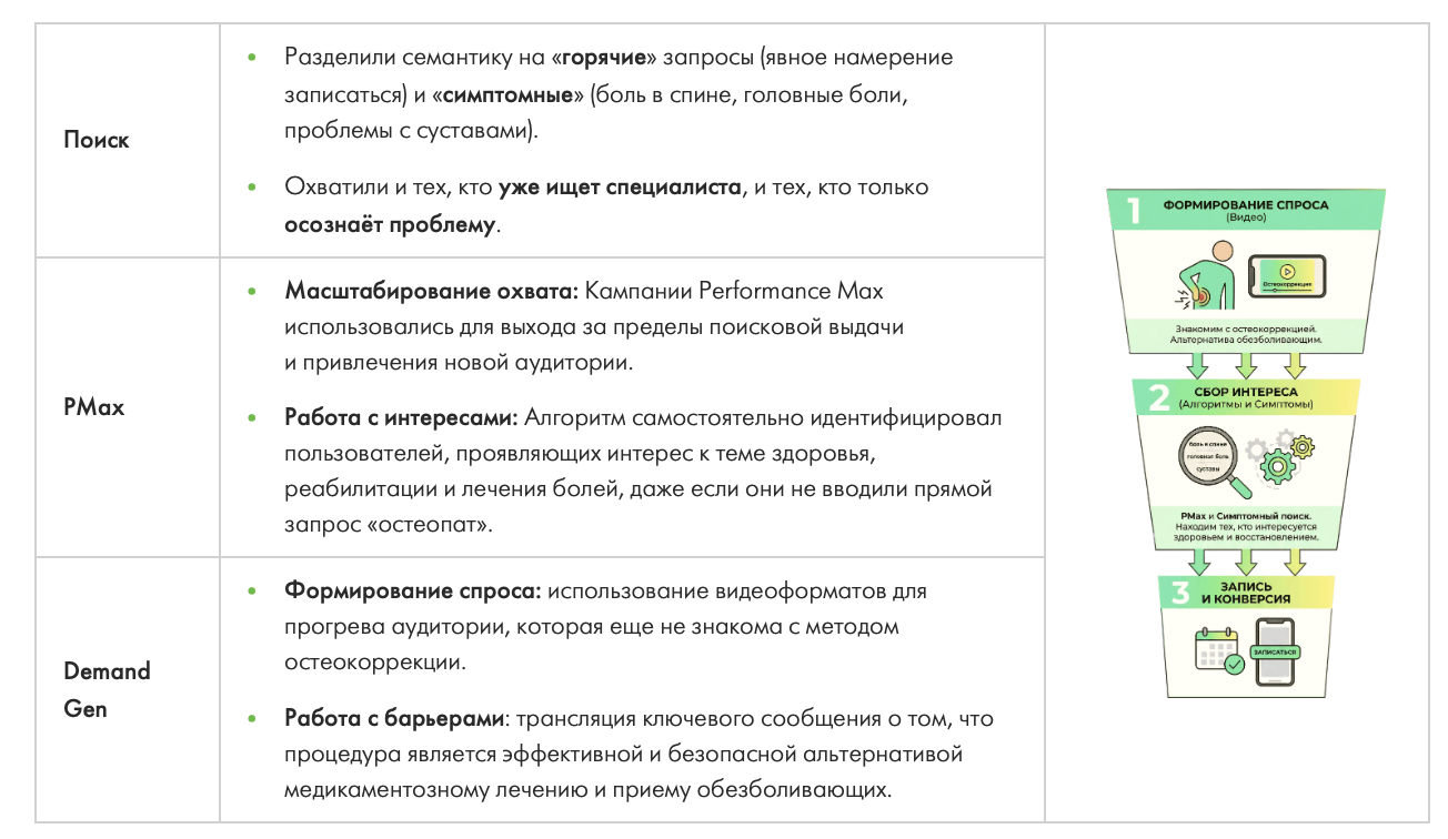 Запуск нового канала (Google Ads): разработать и внедрить многоуровневую воронку продаж (Поиск, PMax, Demand Gen), чтобы охватить как сформированный спрос, так и аудиторию с симптоматическими болями.