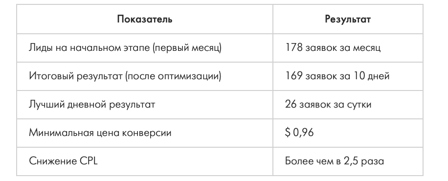Клиент не был готов к масштабированию бюджетов на данном этапе, поэтому сосредоточились на повышении эффективности текущей стратегии: