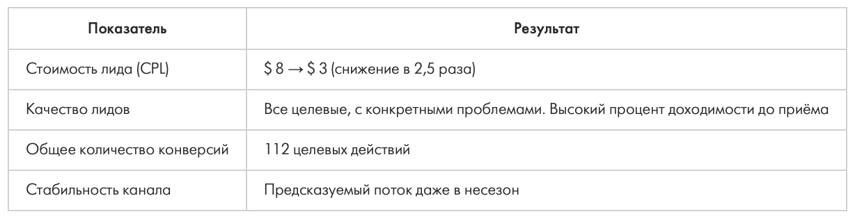 В медицинской нише особенно важно качество трафика: нам нужны не клики, а люди с реальной проблемой и готовностью записаться прямо сейчас.
