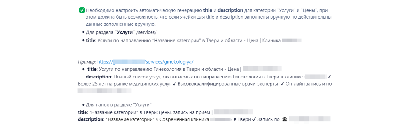Поскольку страниц на сайте заказчика было немало, вместо трудоемкого ручного размещения метатегов мы использовали собственноручно подготовленную и настроенную генерацию заголовков и описаний. Уникализировались эти элементы за счет смены переменных. Техническое задание для разработчика выглядело так: