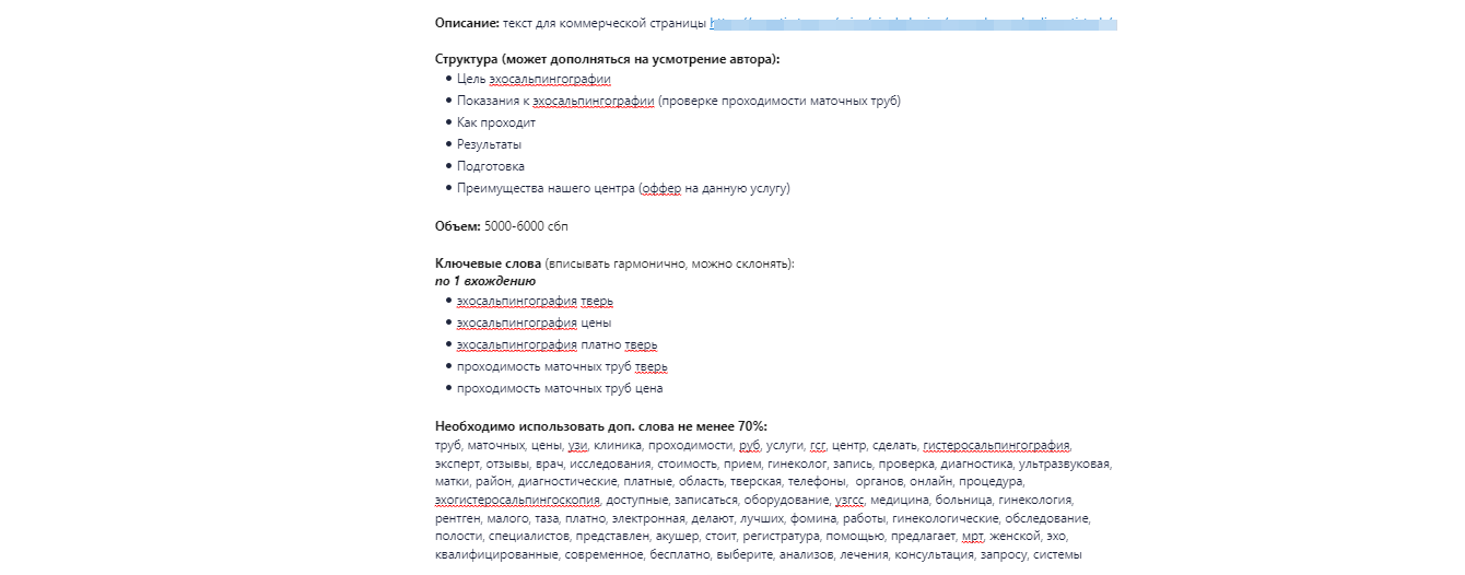 В целом копирайтеры пишут тексты, основываясь на примере контента значимых конкурентов (объем, наименования заголовков и подзаголовков, стиль, число вхождений, визуальное отображение, структура). Одновременно они взаимодействуют с экспертами — врачами клиники.