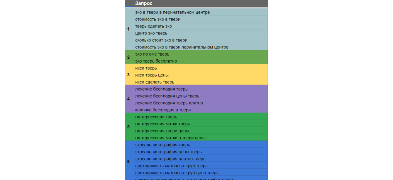 Затем мы собрали и кластеризовали семантическое ядро сайта. Здесь сыграл роль фактор выгодного местонахождения: клиника стремилась привлекать пациентов из Москвы и Подмосковья, где цены на те же программы ЭКО выше, а оснащение и квалификация специалистов в целом такие же.