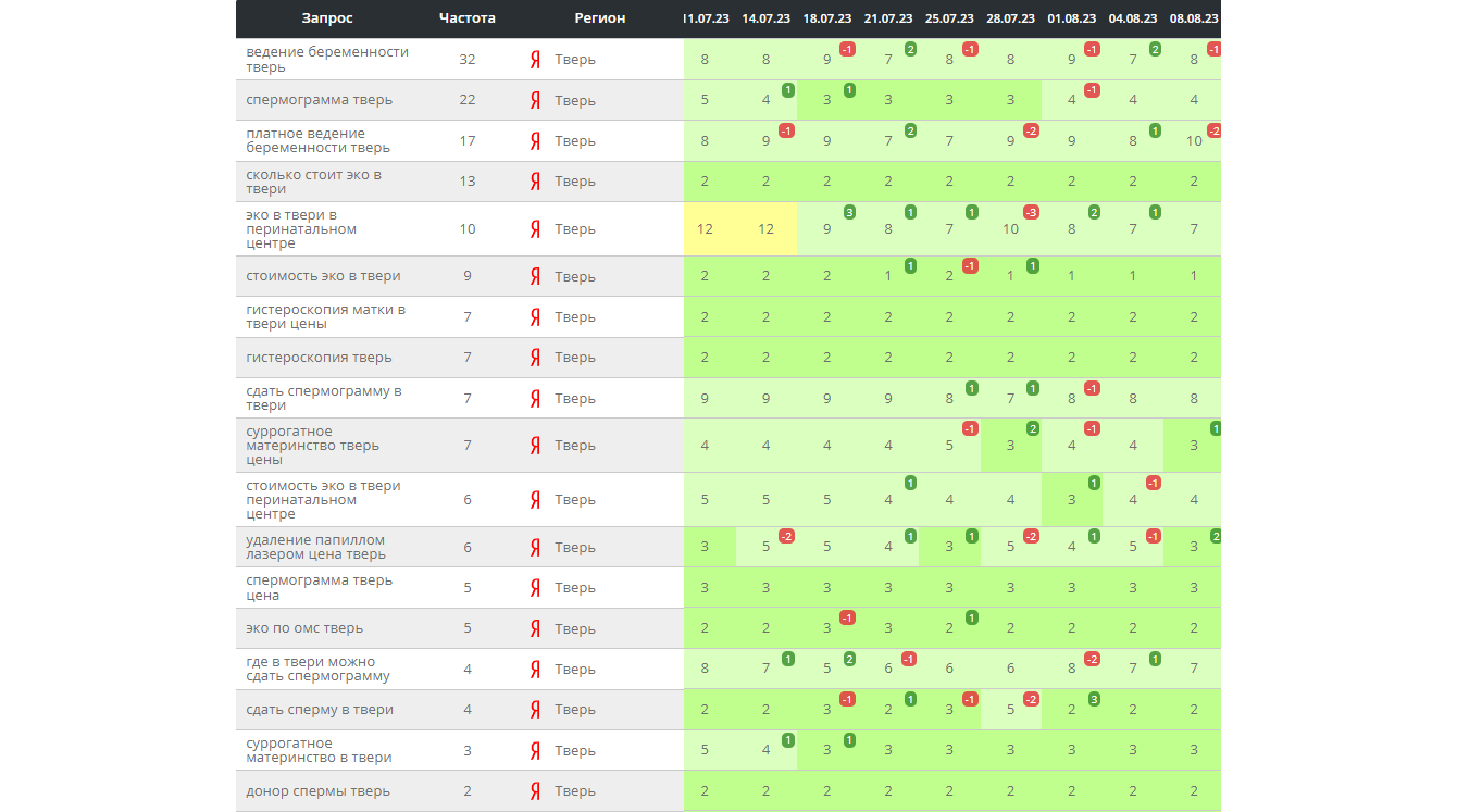 Иными словами, проходить лечение в Твери жителям «столичного региона» значительно выгоднее. Соответственно в семантическое ядро необходимо было включить геонезависимые запросы с такими топонимами, как «в Твери», «Тверь».