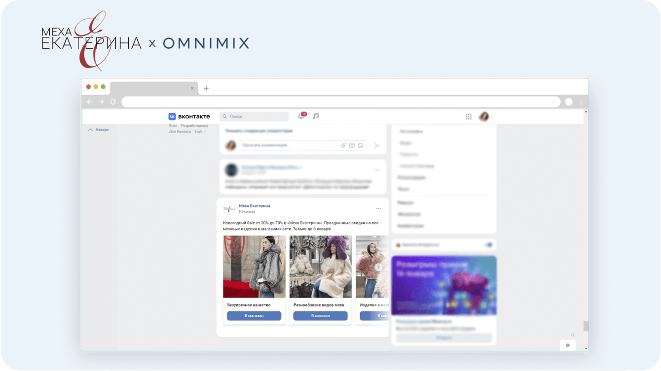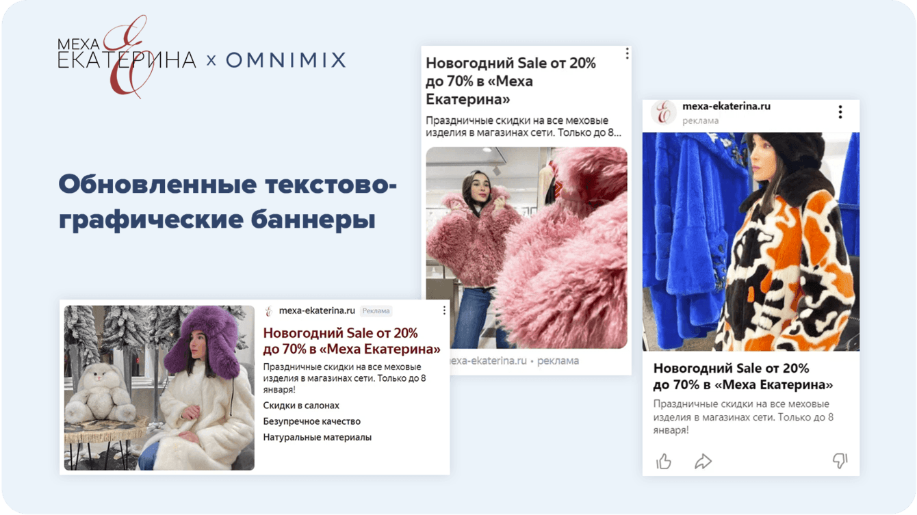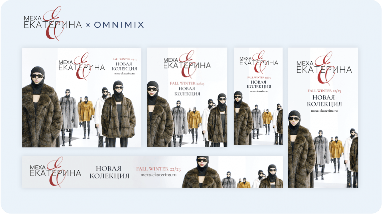 Продвижение продуктов. Клиент обратился к нам для запуска рекламы в двух целях. Первая – анонсирование новой коллекции. Вторая – информирование о новогодней распродаже бренда «Меха Екатерина». Со своей стороны мы подготовили медиаплан, проанализировали лучшие мультиформатные каналы и остановились на нескольких – медийная реклама, видеореклама, контекстная реклама, реклама в социальных сетях.