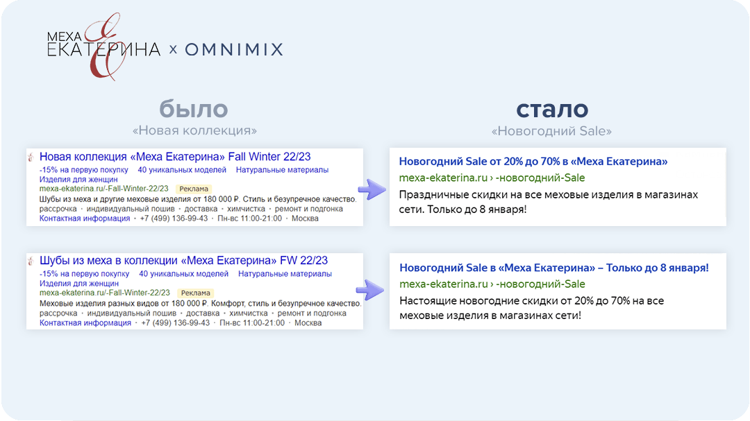 Накануне праздников аудитория ищет варианты новогодних подарков, поэтому рекламные объявления с анонсом распродажи и скидок больше привлекут покупателей, чем рекламные объявления о новой коллекции.