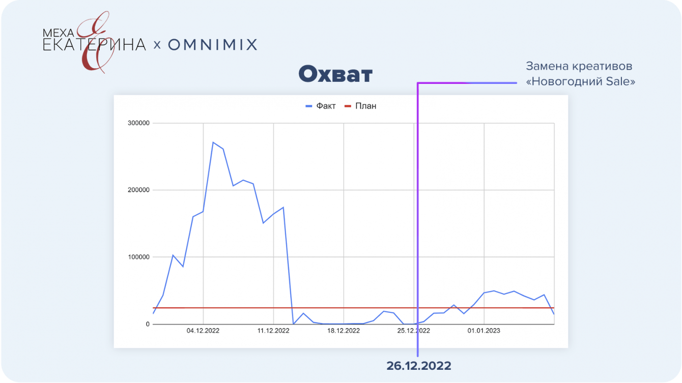Видеоролики, запущенные в самом начале кампании, принесли всплеск по охвату, который в дальнейшем пошел на логический спад из-за смещения фокуса в целях в сторону конверсионности.