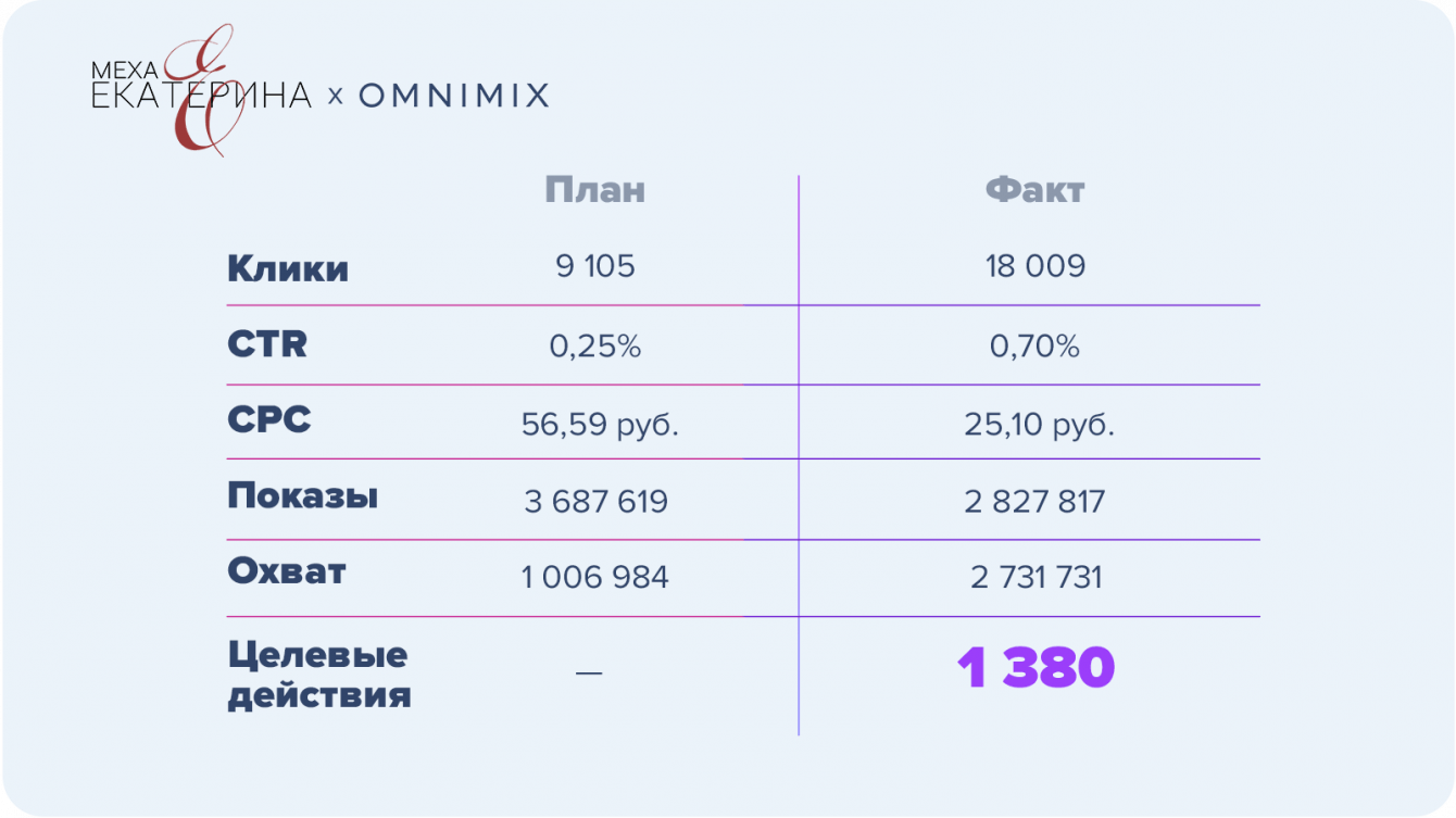 Итоговые фактические показатели: клики – 18 009, CTR – 0,70%, CPC – 25,10 руб., показы – 2 827 817, охват – 2 731 731.