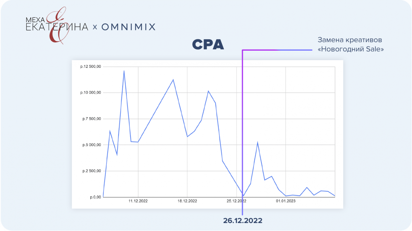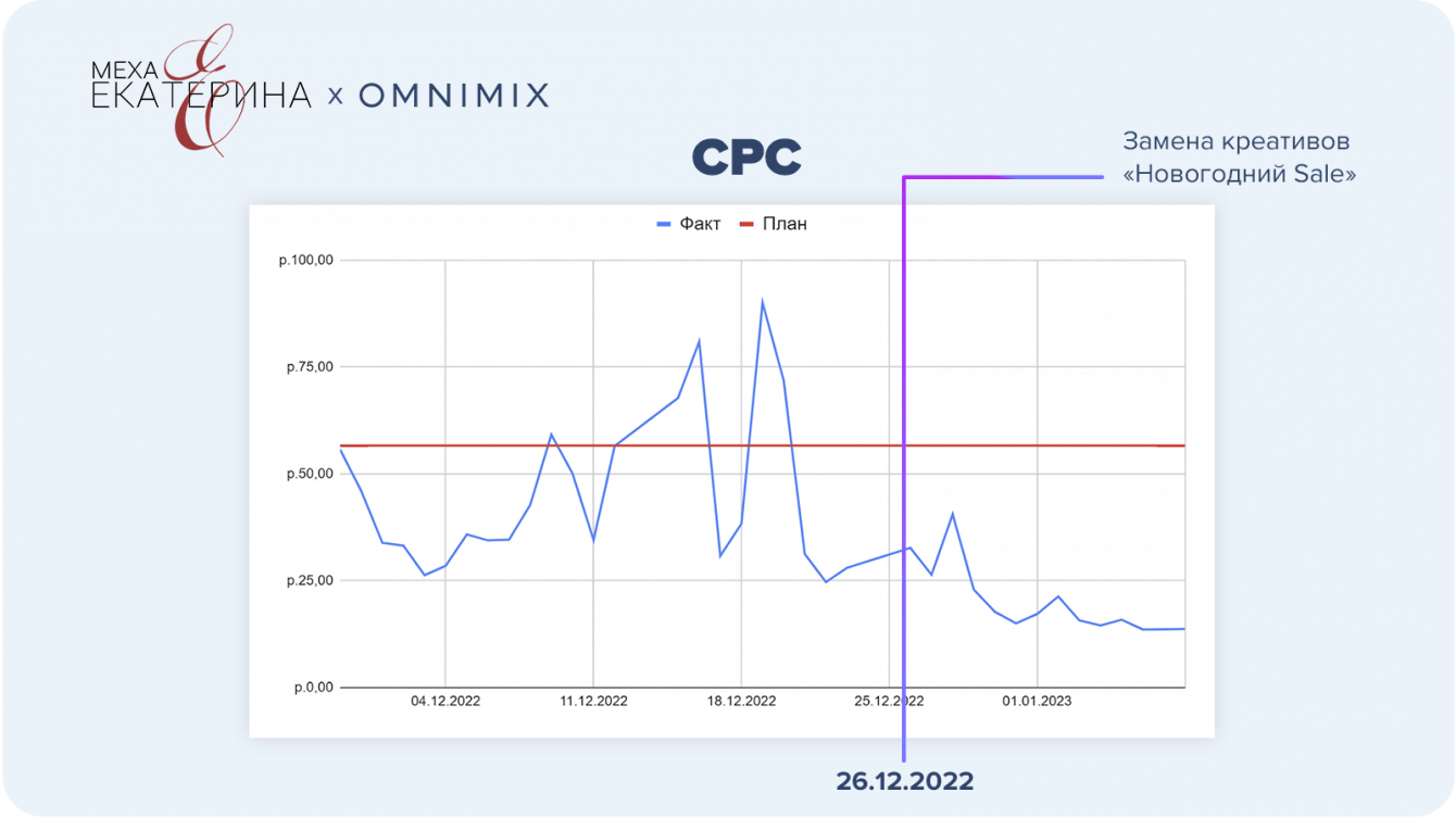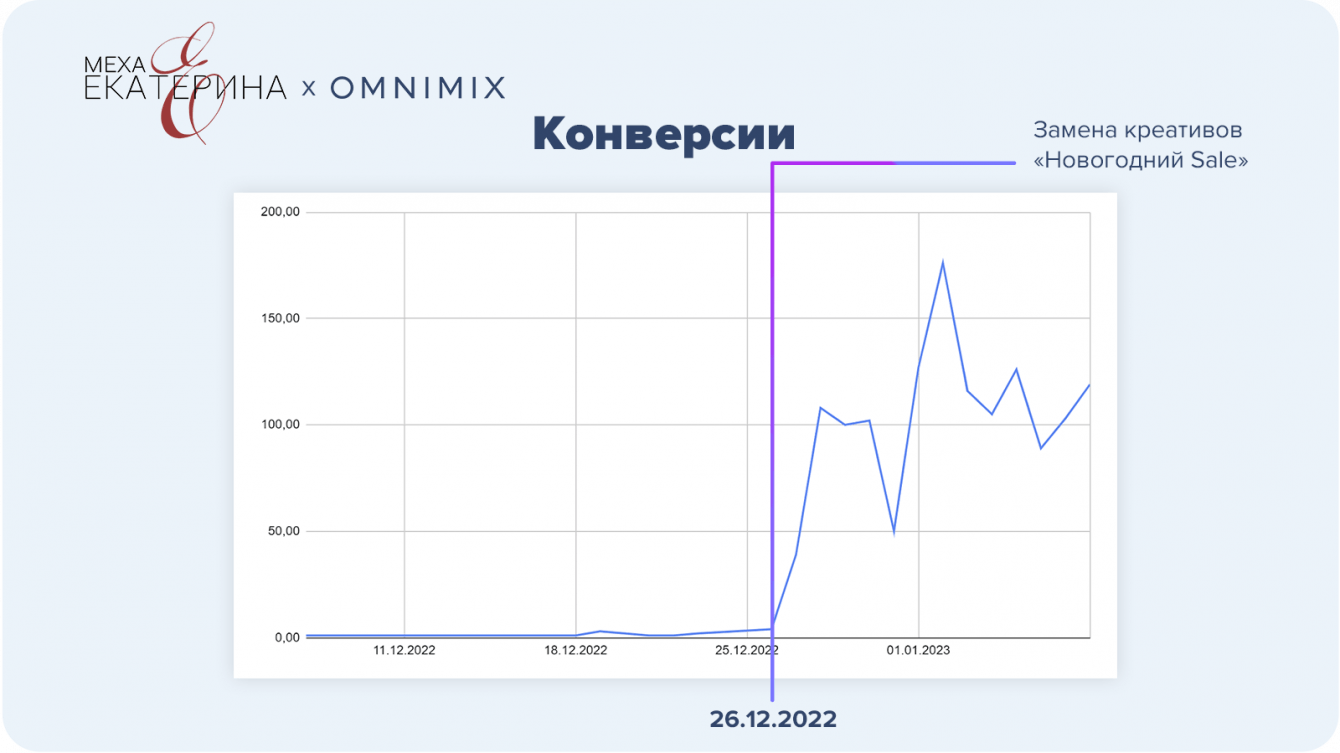 Запуск рекламной кампании 26.12.2022 г. с новогодней распродажей положительно повлиял на рост конверсий.