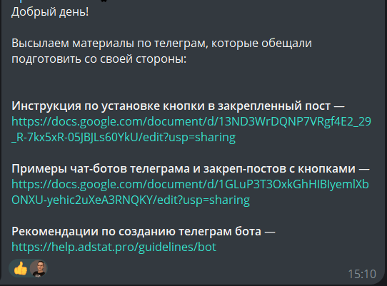 Позднее мы дали рекомендации по сборке телеграм-бота от поддержки сервиса Adstat.pro – через него создали рекламный кабинет и запустили на него трафик с целью сбора базы под рассылку и знакомства аудитории с услугами сервиса.