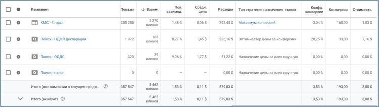 Изначально в работе было два формата рекламных кампаний: поиск и КМС. Обычно, в Google Ads достаточно узкой горячей семантики и поиска, но тут объем запросов был мал – в итоге весь бюджет мы переключили на КМС. Переход на весь русскоязычный мир позволил получить значительно больше показов.