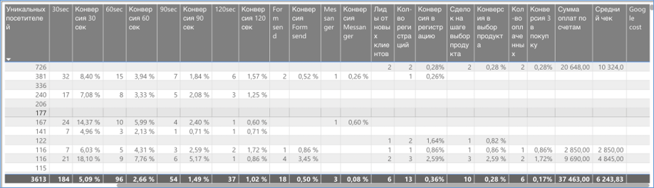 Помимо оптимизации рекламных кампаний, мы постоянно анализировали промежуточные конверсии: время, проведенное пользователем на сайте, страницы, выбранные для посещения, формы, которые заполняет, по каким ссылкам кликает.