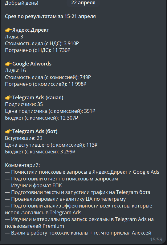 Еженедельные отчеты отправляем в таком формате. Структурированная подача информации помогает клиенту всегда быть в курсе о результатах сотрудничества, а нам – строить прозрачные, доверительные отношения с клиентом.