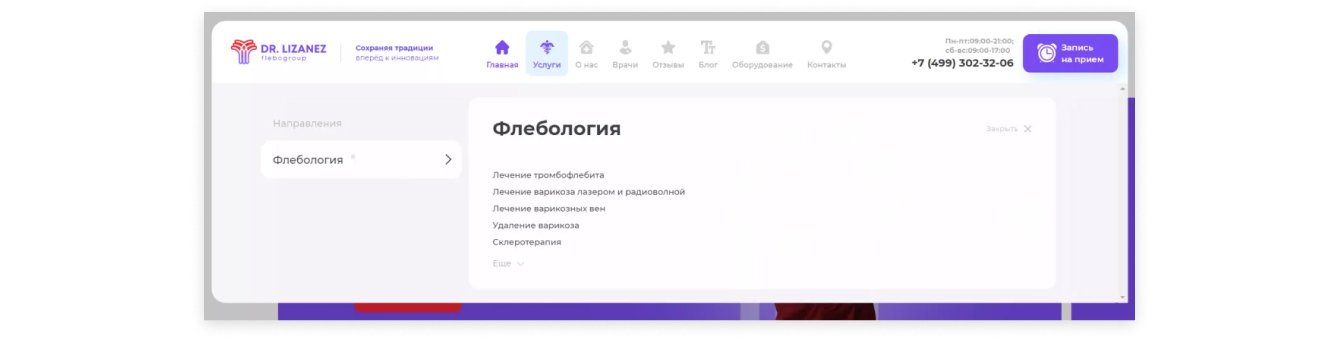 При наведении курсора на услуги появляется выпадающее меню с услугами флеболога: