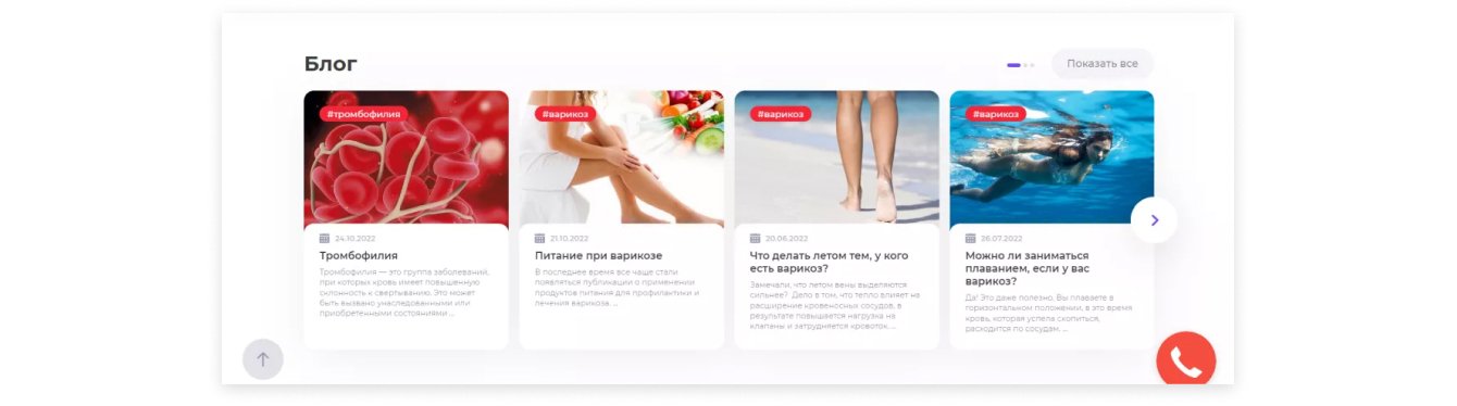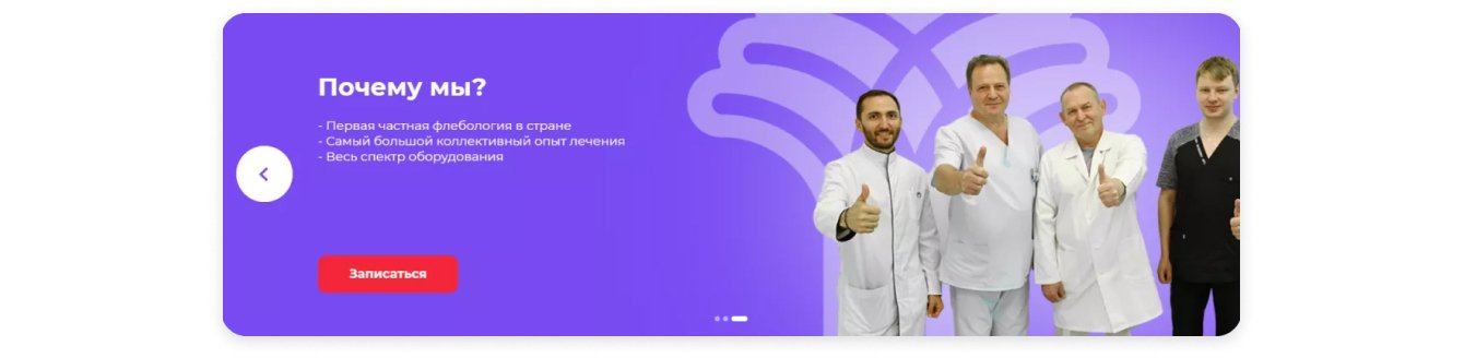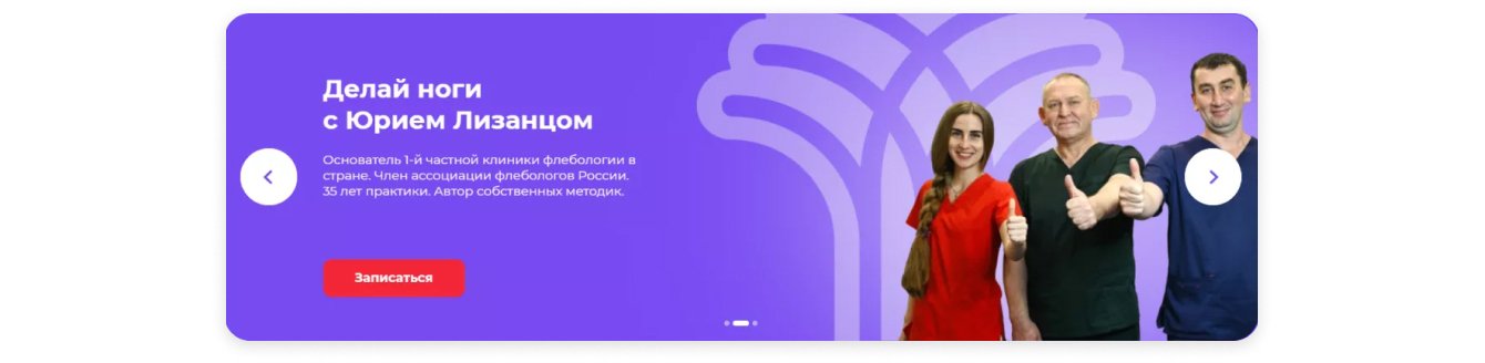 Из этого блока пациент может перейти на персональную страницу специалиста или записаться на прием, пролистав слайдер до подходящего ему врача.