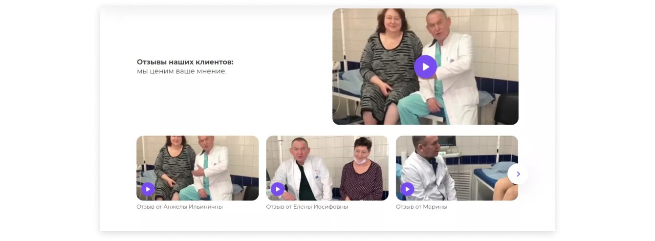 Это очень важный аргумент для потенциальных пациентов. К тому же видеоотзывы вызывают больше доверия, наиболее информативны и повышают поведенческие показатели на сайте. За счет этого блока мы не только коммуницируем с пациентами, мотивируя их записаться, но и благоприятно влияем на SEO.