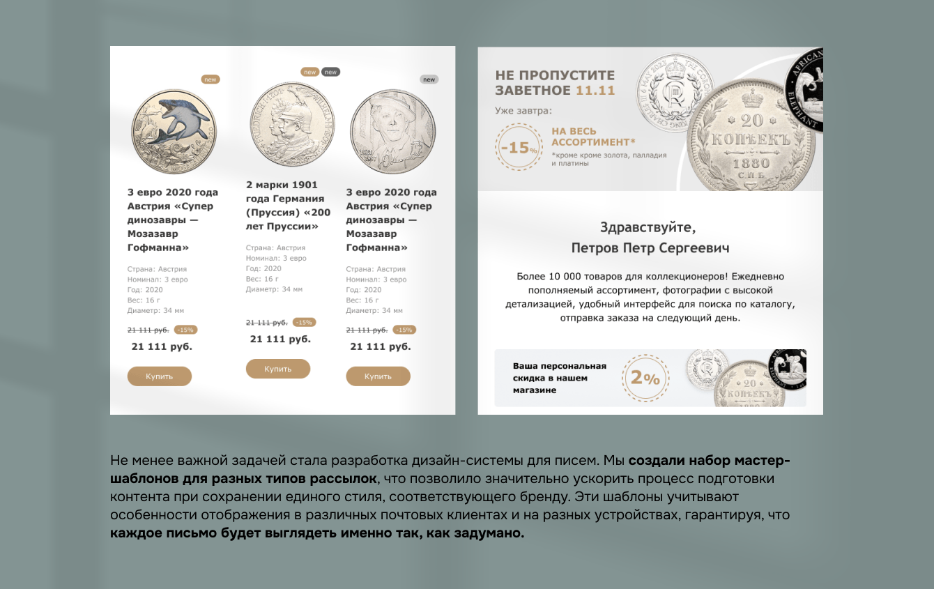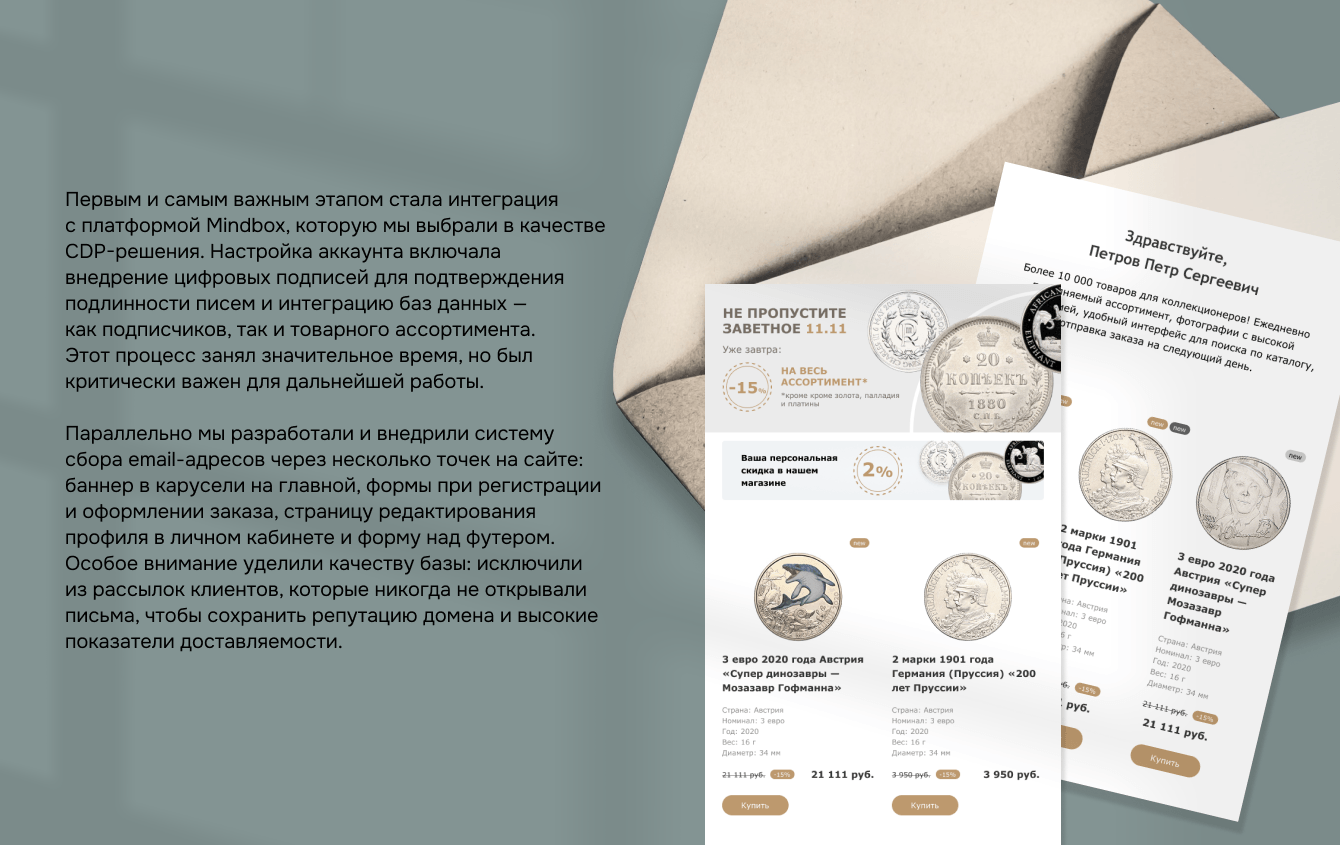 Нумизматика как тематика предоставляет широкие возможности для email-маркетинга. Мы разработали комплексный контент-план, включающий четыре основных типа коммуникаций. Транзакционные письма информируют клиентов о статусах их заказов. Триггерные сценарии автоматически отправляют персонализированные сообщения, например, когда пользователь подписывается на рассылку или когда снижается цена на товар в его корзине. Для акционных кампаний мы создаем специальные письма с информацией о спецпредложениях. Но самыми насыщенными стали тематические рассылки, в которых через интересные исторические факты, рассказы об архитектуре, искусстве и географии мы ненавязчиво презентуем соответствующие подборки монет и банкнот. Такой подход превращает email-маркетинг из инструмента продаж в ценное содержание для подписчиков, что в конечном итоге повышает лояльность и вовлеченность аудитории.