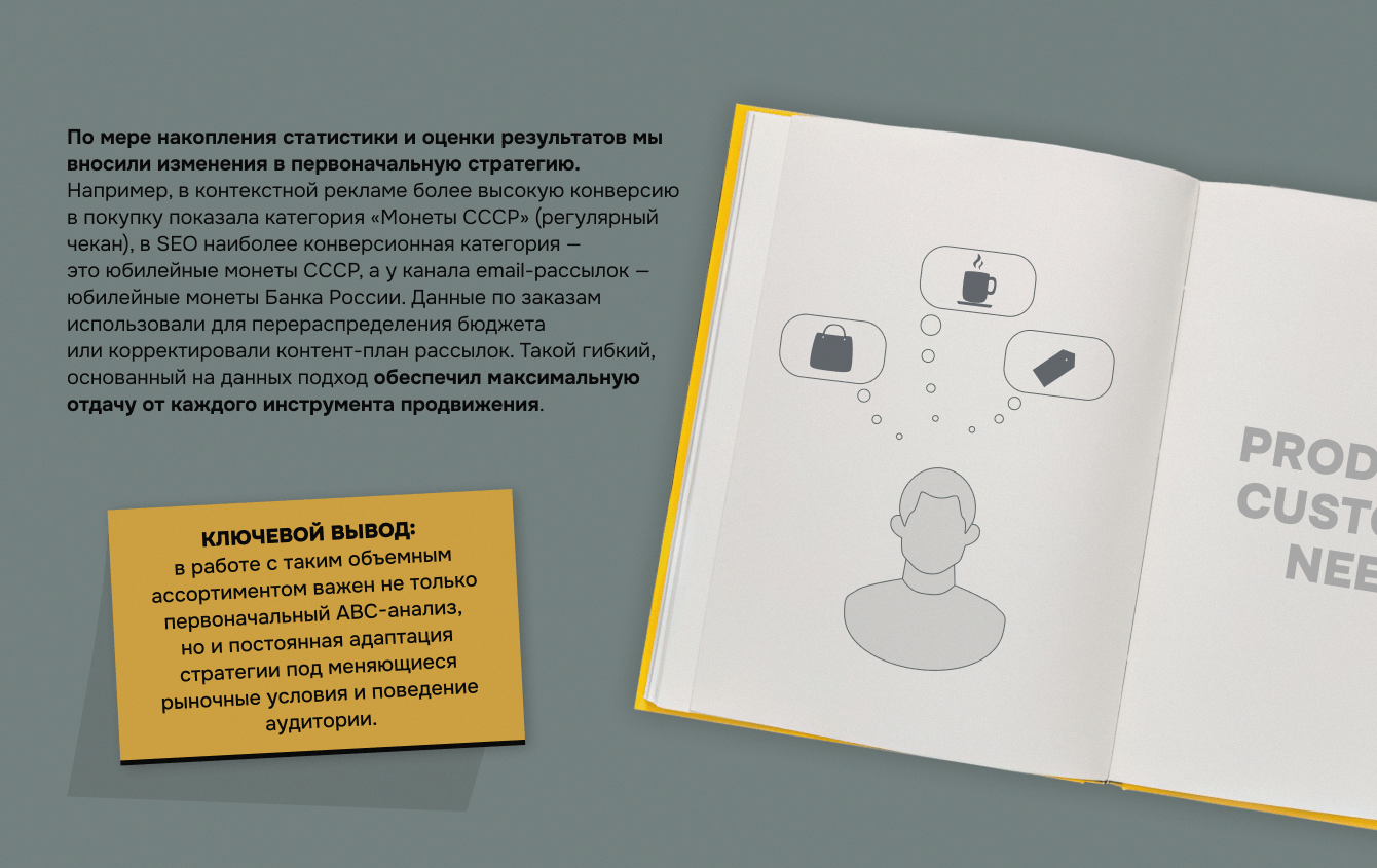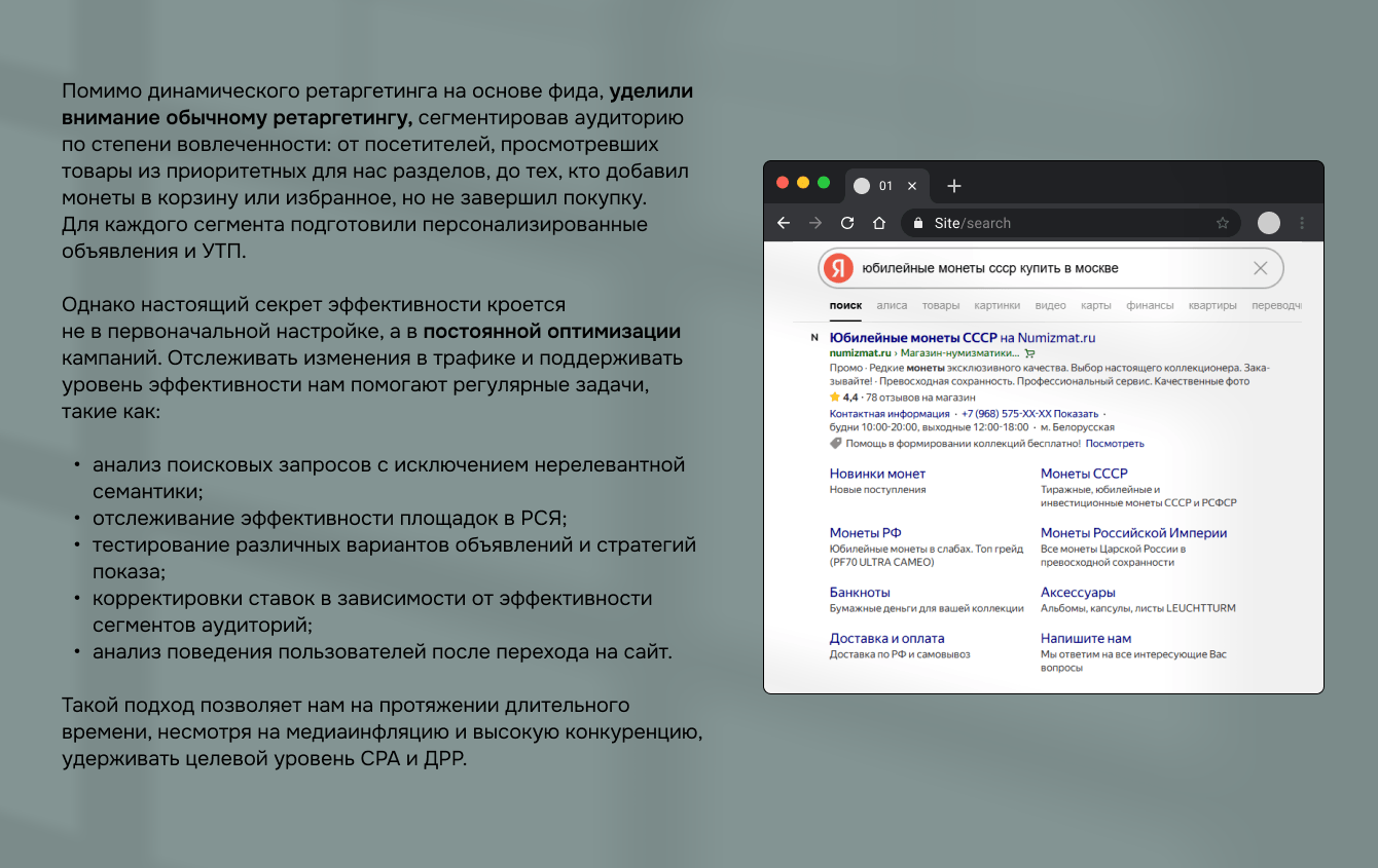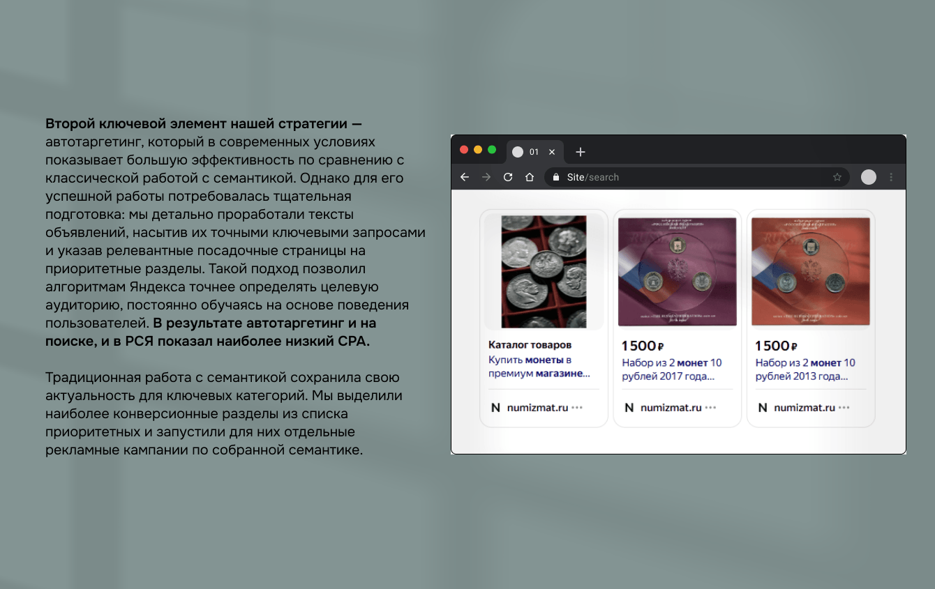 Стратегию продвижения строили на комплексном охвате пользователей на всех этапах воронки: когда пользователь проявляет интерес к тематике, когда активно ищет и выбирает товар, когда уже готов к совершению покупки. Так мы можем выстраивать непрерывную коммуникацию, оставаясь в поле зрения потенциальных клиентов и подводя к решению о приобретении именно в numizmat.ru.