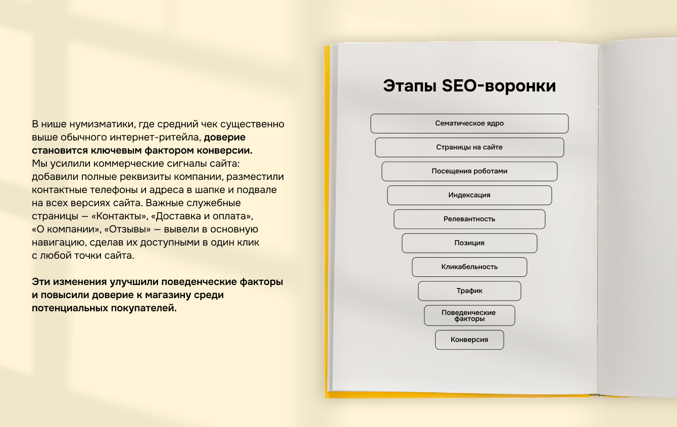 Собрав и проанализировав семантическое ядро по ключевым разделам, мы переработали текстовую составляющую сайта. Обновили метатеги Title и Description для всех страниц. Особое внимание уделили заголовкам H1: они теперь точно отражают содержание страниц и включают основные ключевые запросы. На основе анализа конкурентов и поисковых трендов создали новые страницы под узкие тематические запросы, а для самых посещаемых разделов разработали развернутые SEO-тексты с экспертной информацией, которая действительно полезна коллекционерам.