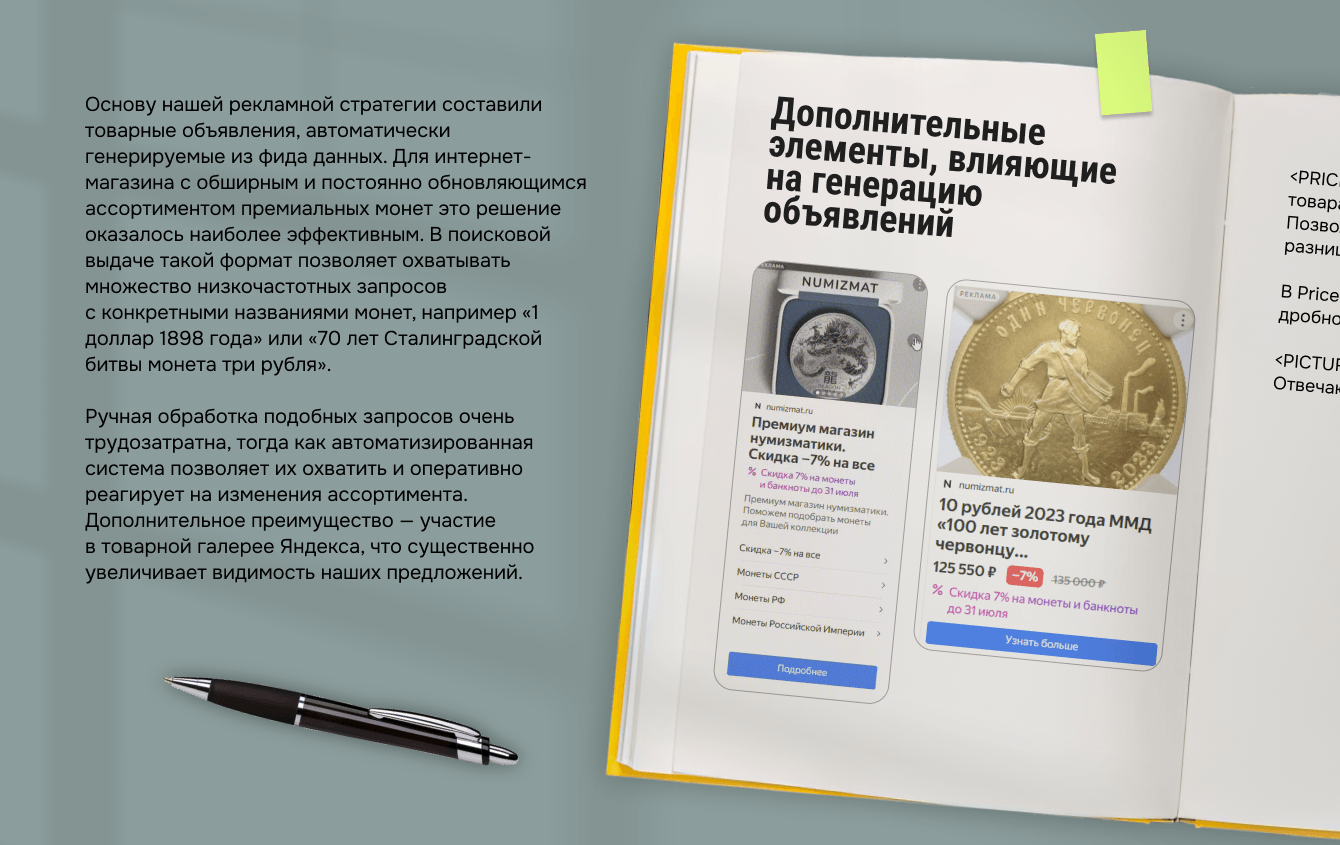 В рекламной сети Яндекс товарные объявления демонстрируют не меньшую эффективность. Для «холодной» аудитории система показывает монеты тематик, к которым пользователи проявляли интерес, а для тех, кто уже посещал сайт, — конкретные просмотренные или похожие экземпляры. Визуальная составляющая играет здесь ключевую роль: потенциальный покупатель сразу видит изображение монеты и ее цену, что обеспечивает фильтр по платежеспособности и степени заинтересованности.