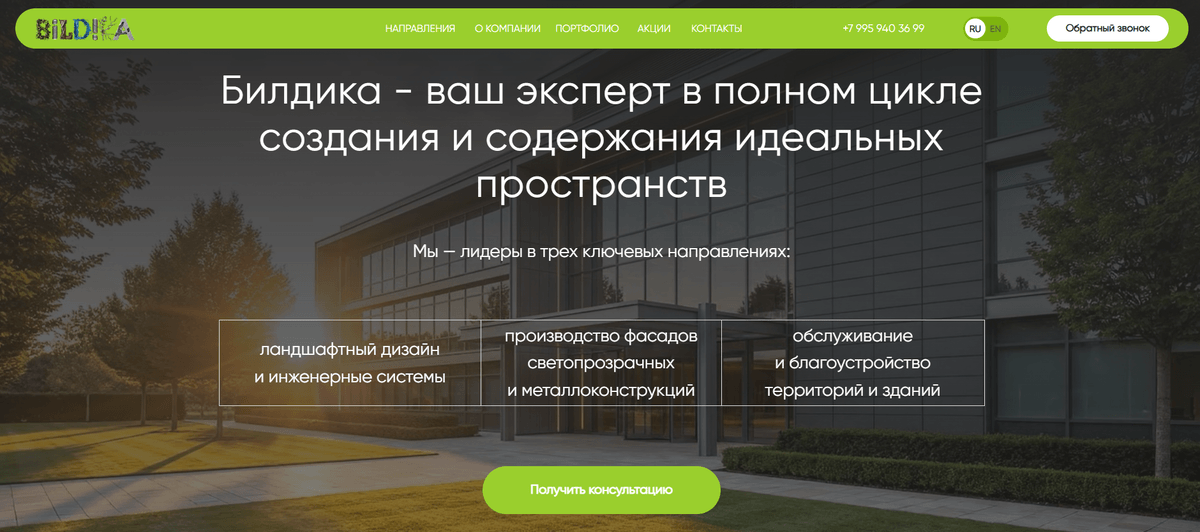 Клиент обратился с запросом обновить существующий сайт ландшафтной компании. Изначально компания занималась только ландшафтным дизайном, но затем расширила спектр услуг — появились фасады и обслуживание ухоженных территорий. Старый сайт перестал соответствовать реальности и не отражал новые направления бизнеса.