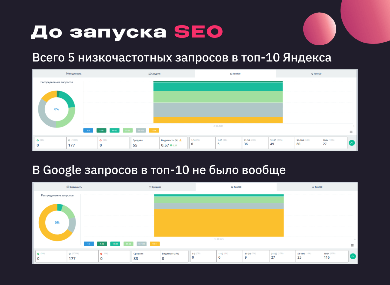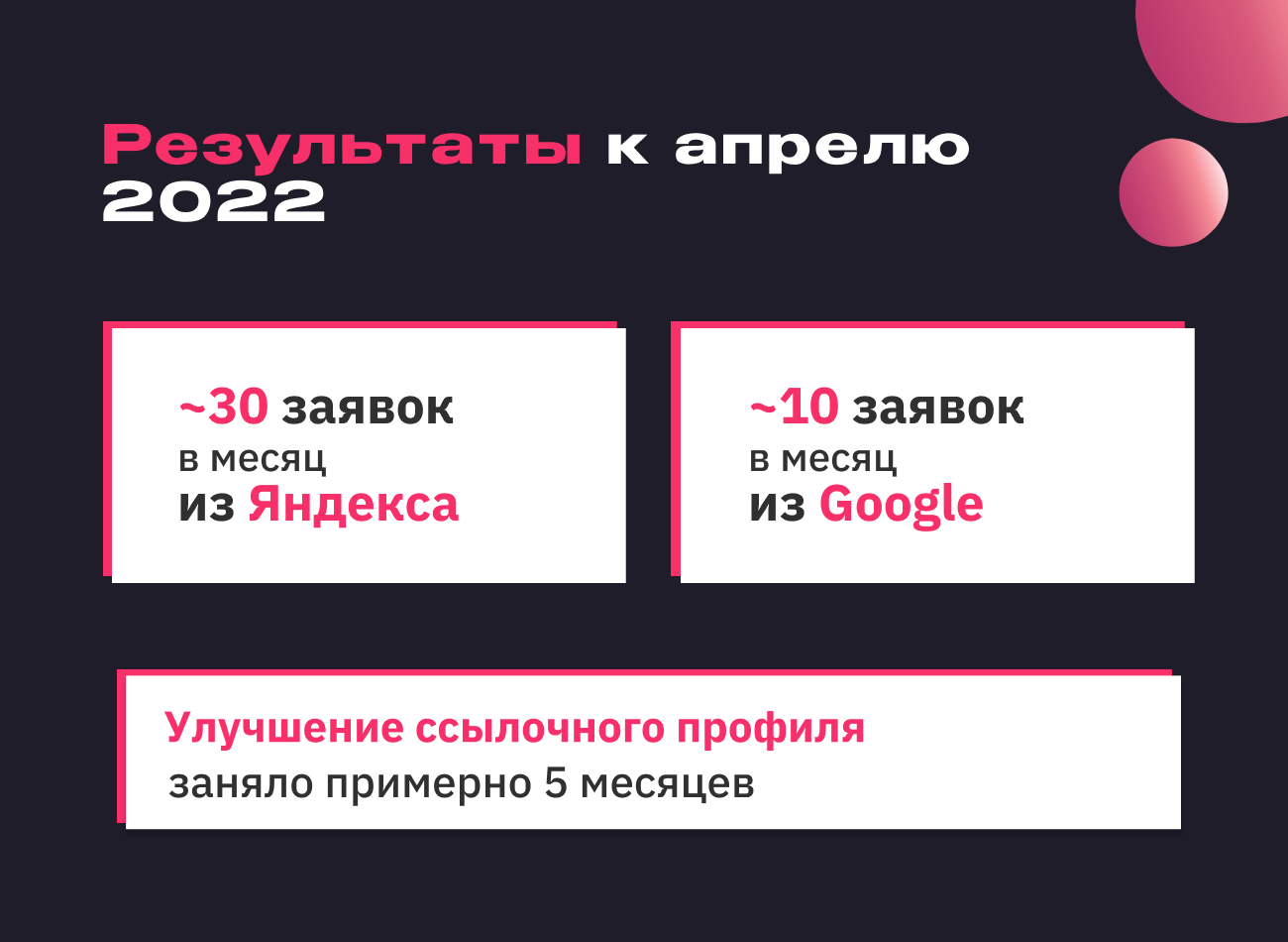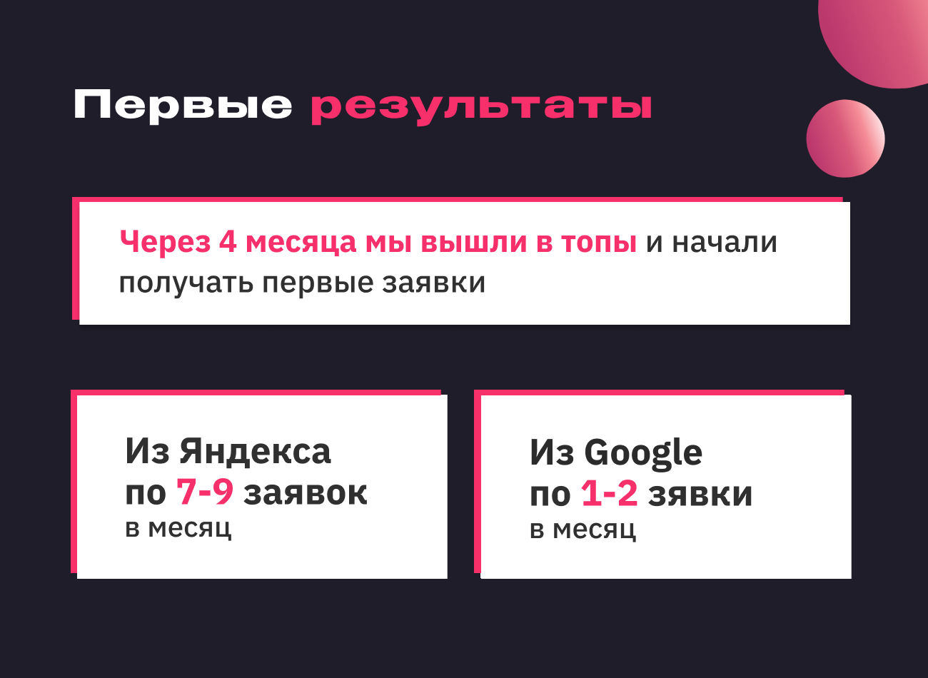 По мере роста бизнеса нужно было расширять инструменты лидогенерации, и к концу 2021 года запустили SEO. К этому времени у клиента появился дополнительный бюджет.