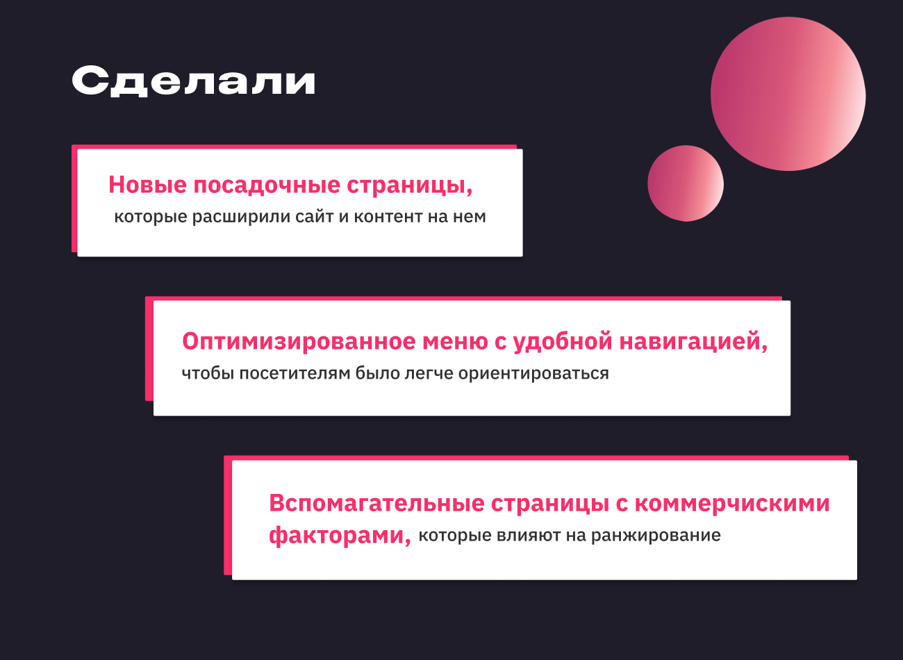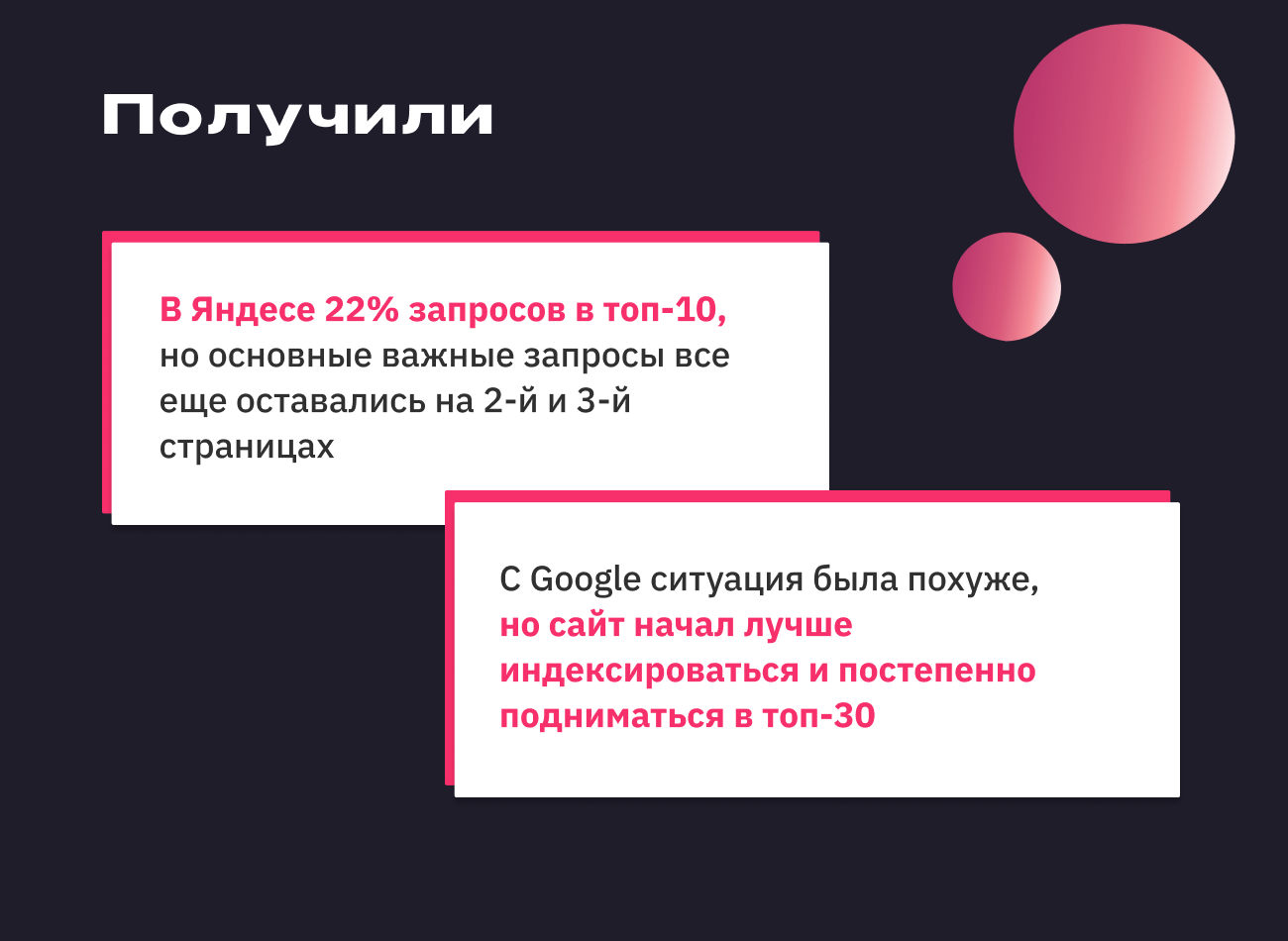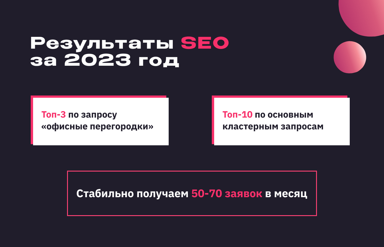 По мере роста бизнеса нужно было расширять инструменты лидогенерации, и к концу 2021 года запустили SEO. К этому времени у клиента появился дополнительный бюджет.