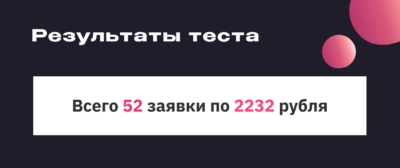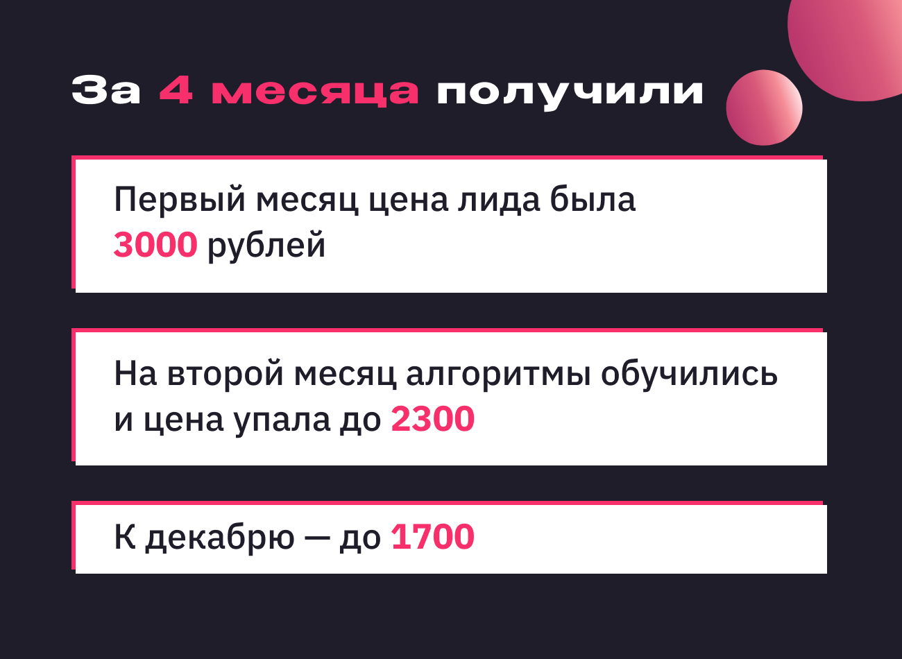 Сейчас заказчик получает лиды по ≈2400 ₽. Это на уровне изначального прогноза, но мы все равно ищем способы удешевить заявки.