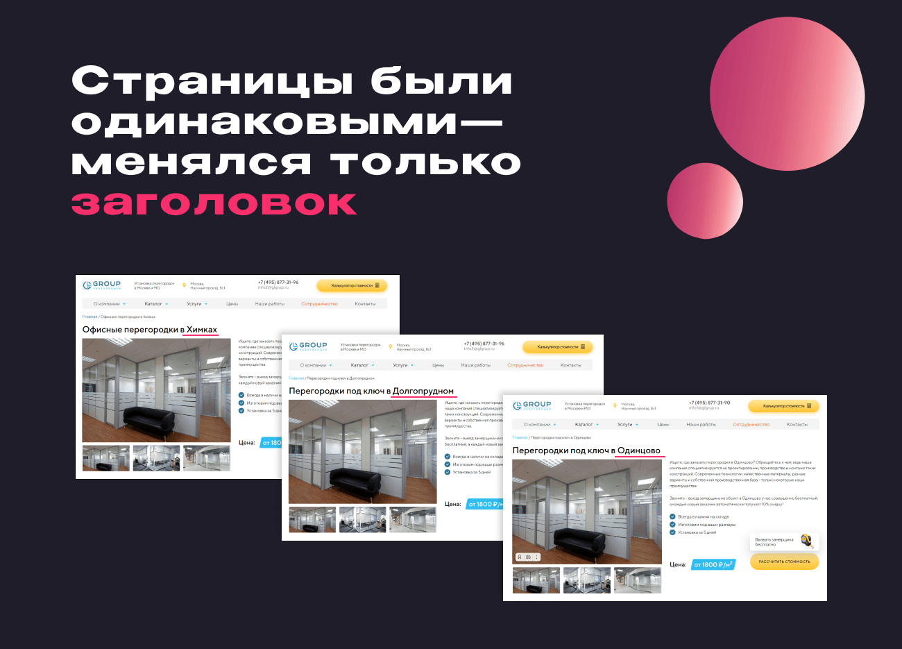 Теперь нужно было расширять географию. Составили список всех крупных городов и населенных пунктов Московской области: Люберцы, Подольск, Дмитров, Балашиха и другие. Для каждого города сделали отдельную страницу.