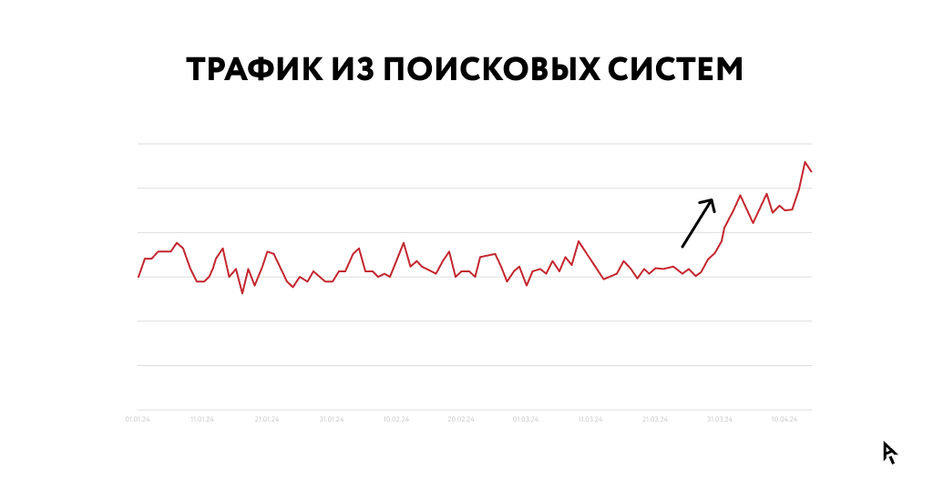 На инфографике ниже показали, как изменялся совокупный трафик из поисковых систем Яндекс и Google. С января 2023 года наблюдалось падение объема входящего трафика. Весной 2023 года мы подключились к проекту. Напомним, что заметные результаты в SEO появляются примерно через шесть месяцев. Тем не менее уже в июне 2023 года наметился подъем трафика, затем он немного снизился, а с сентября 2023 года фиксируется устойчивый рост.