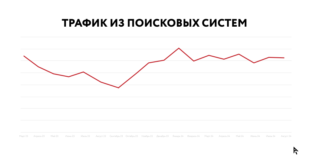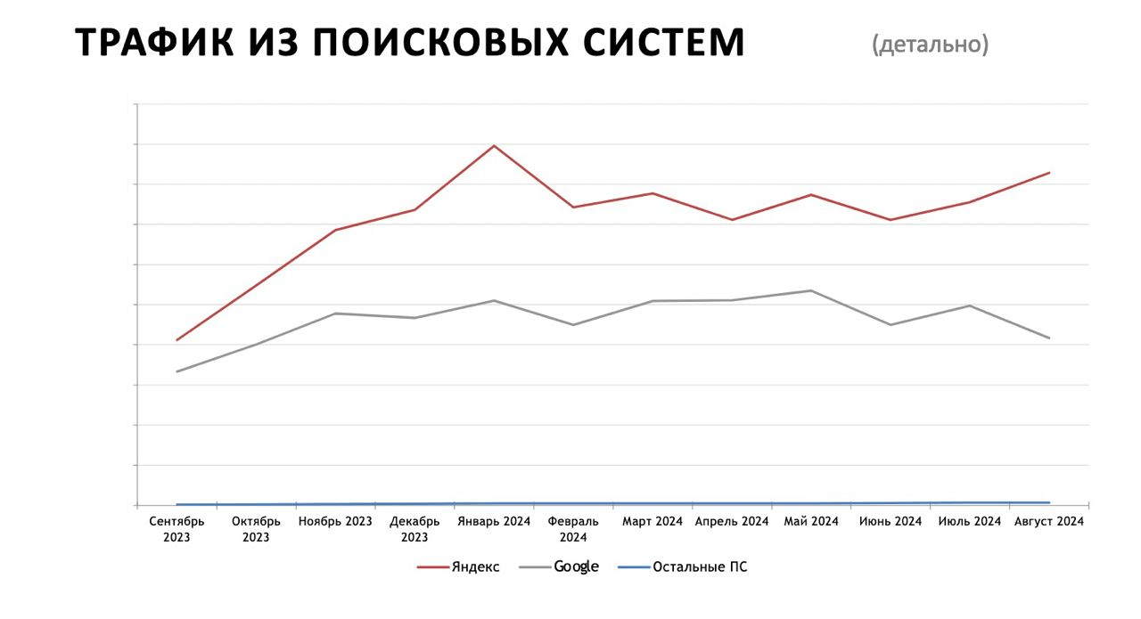 Нам удается ежемесячно увеличивать трафик из поисковых систем по сравнению с аналогичным периодом прошлого года. Например, в августе 2024 года рост составил 1, 4 раза относительно августа 2023. Есть и другие показатели NDA.