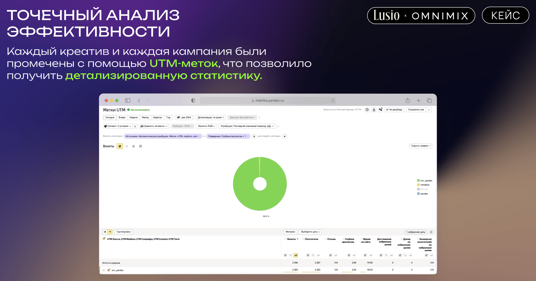 1. Детальная UTM-разметка. Каждый баннер, каждое видео и каждая кампания были промечены с помощью UTM-меток. Это позволило получить детализированную статистику, разложенную по таким параметрам, как формат, кампания, группа объявлений, настройки и креативы.