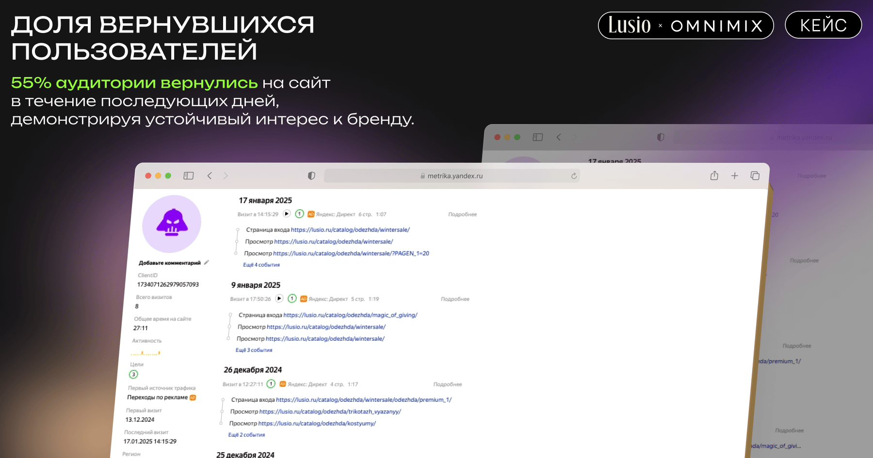 • Доля вернувшихся пользователей: 55% аудитории вернулись на сайт в течение последующих дней, демонстрируя устойчивый интерес к бренду.