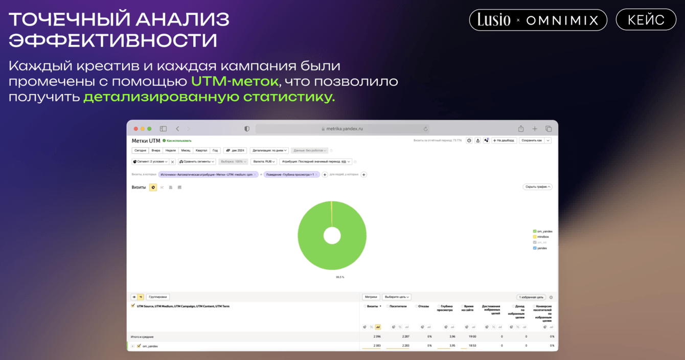 • Долгосрочная стратегия – залог успеха. Медийная реклама эффективна не только в краткосрочной перспективе, но и для формирования долгосрочной лояльности и узнаваемости бренда. Высокий процент вернувшихся пользователей в кейсе LUSIO подтверждает этот вывод.