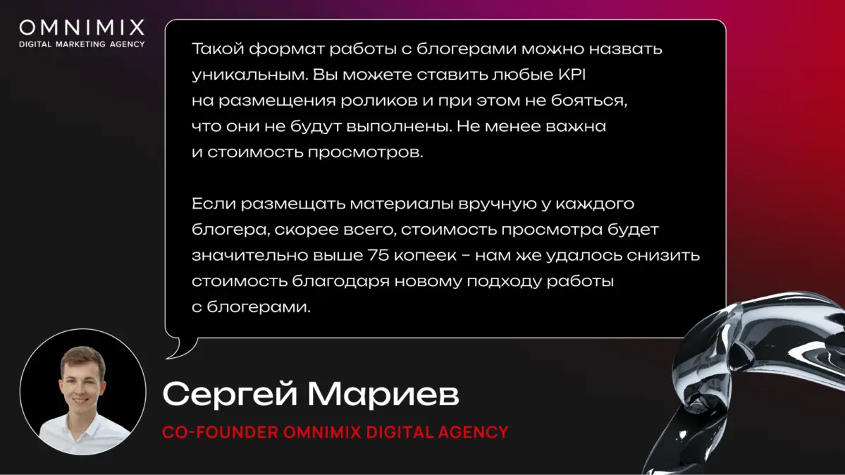 Понимая это, мы решили внедрить принципиально новый подход. Мы изменили формат работы с блогерами: если клиенту нужны просмотры – значит, и блогерам мы платим за просмотры. Конечно, далеко не все готовы пойти на этот прогрессивный формат работы с оплатой за результат. Однако мы уверены, что рано или поздно количество блогеров, согласных на работу с такими условиями, будет становиться только больше.