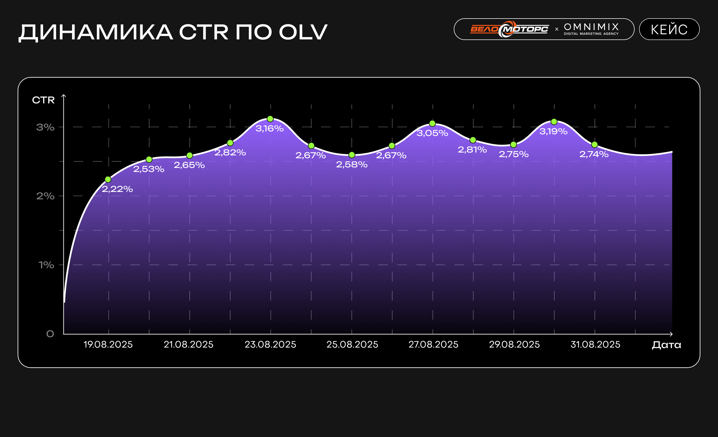 В OLV-сегменте на старте зафиксировано снижение CTR до 0,4%. Команда провела реконфигурацию кампании с пересмотром источников трафика и усилением KPI-ориентированной оптимизации. Показатель CTR восстановился до планового значения (1%) и превысил его.